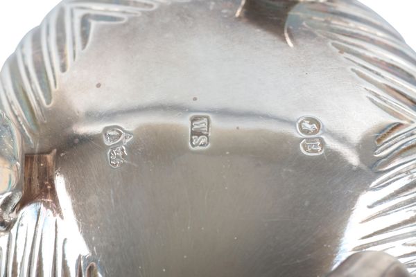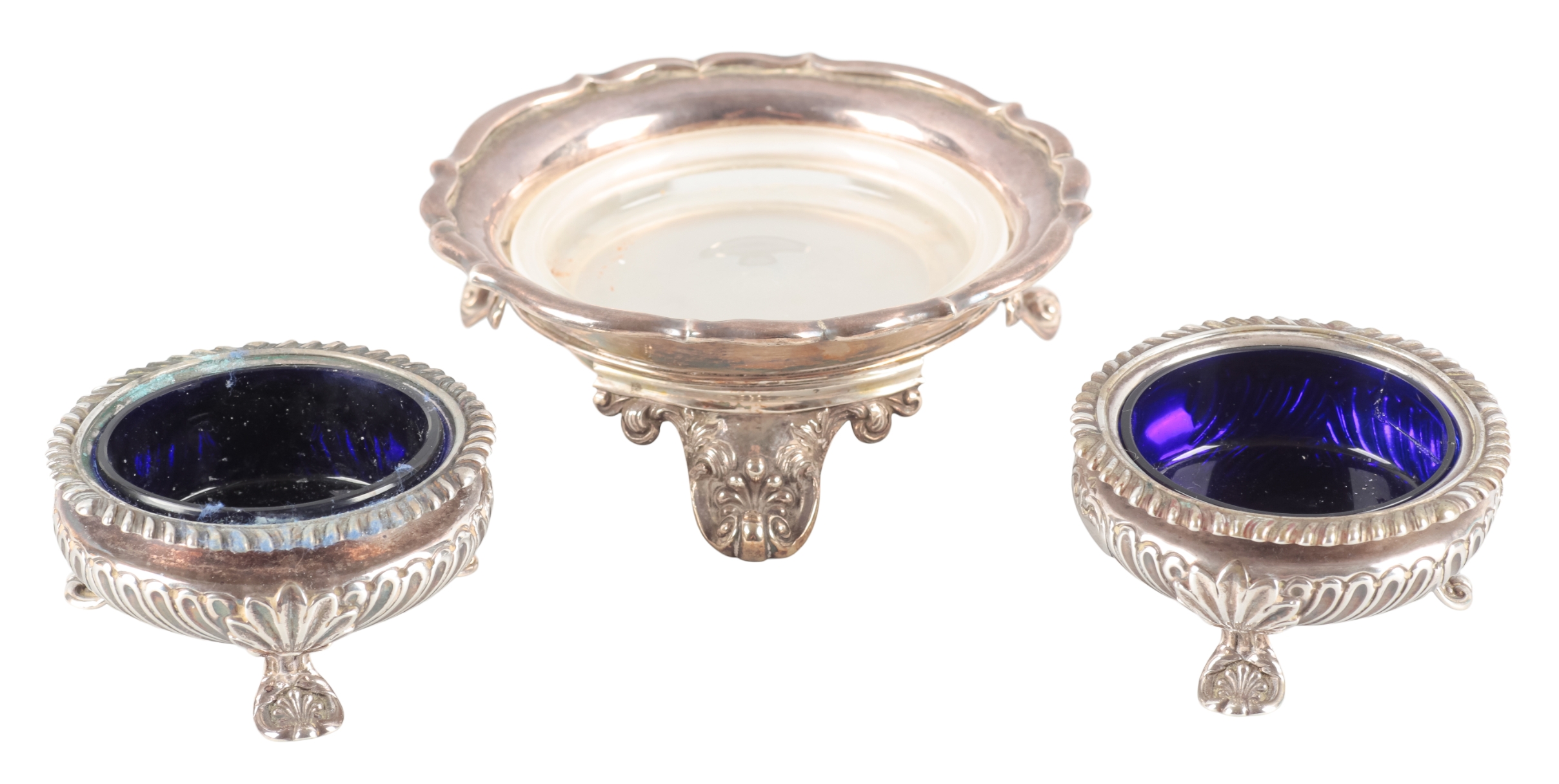 by A. B. Savory, London 1856, with waisted and fluted bodies on shell stylised feet, with glass liners, 8cm diameter; together with a William IV silver wine coaster by William Hewitt, London 1835, 12 tr. ozs combined (3)