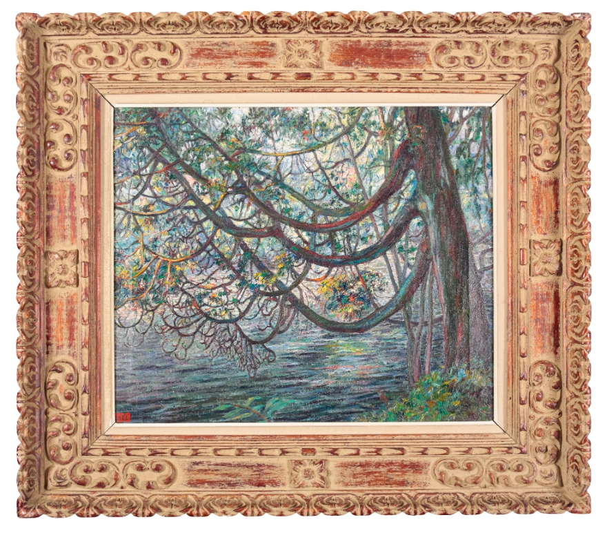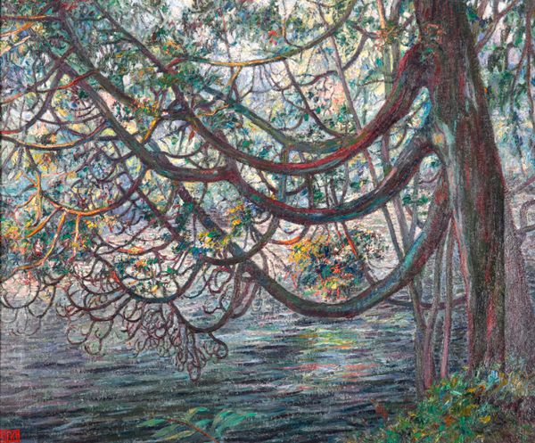 a tree to the foreground with low hanging branches signed lower left, oil on canvas, 48.5cm x 58.5cm