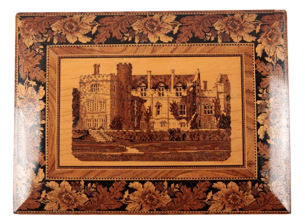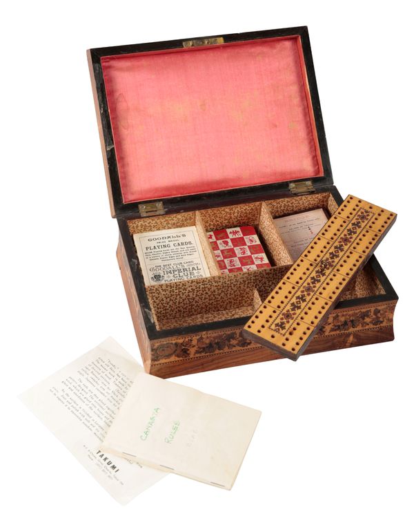 19th century, the waisted rectangular box with central marquetry scene depicting a castellated country house and garden set within floral borders, opening to reveal a fitted interior with playing cards, board and instructions for bridge, 8.5cm high x 24cm wide x 18cm deep