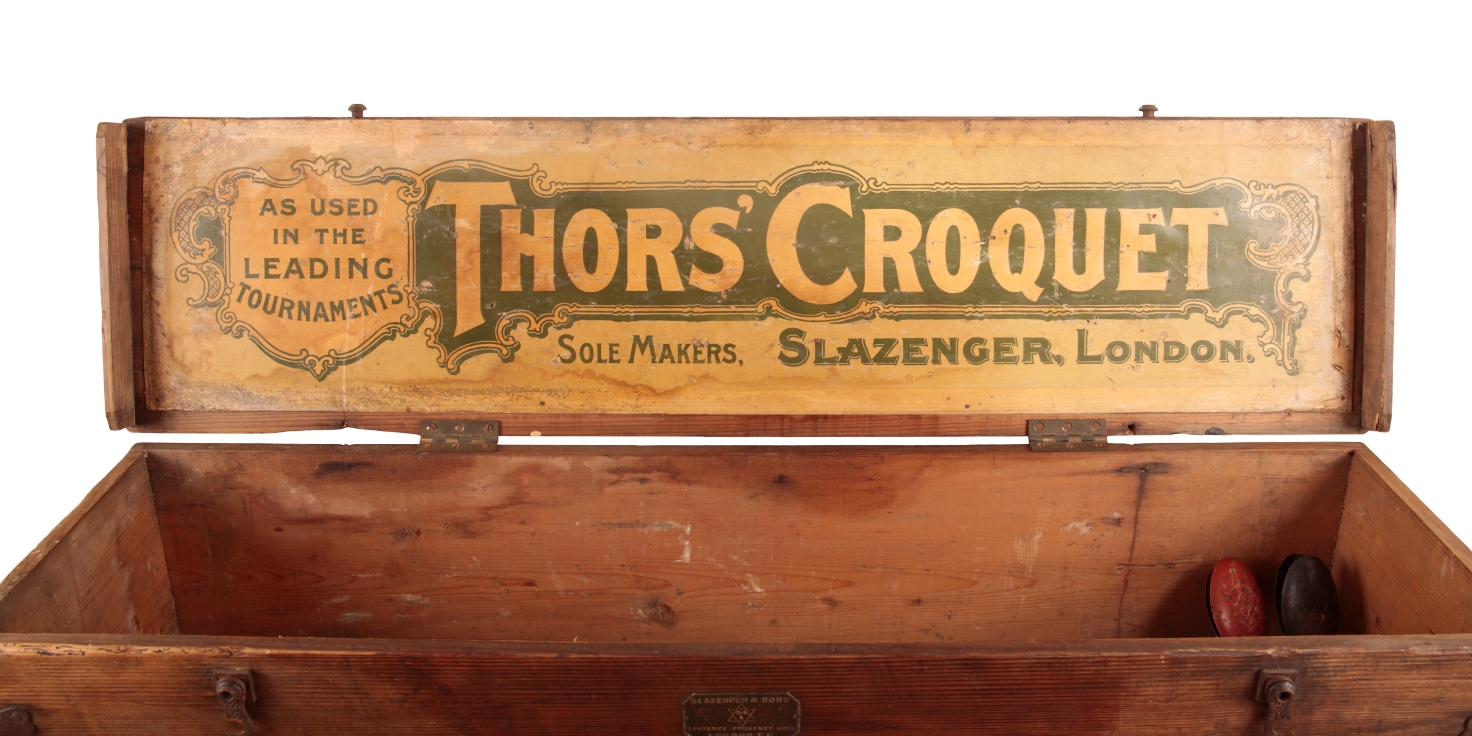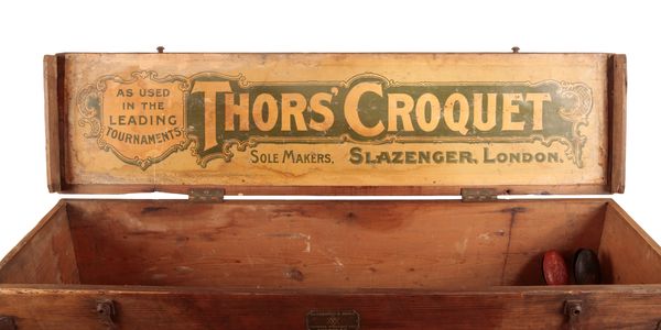 The set includes a black, red, yellow and blue mallet and ball, six hoops and a center pole, all cased.
