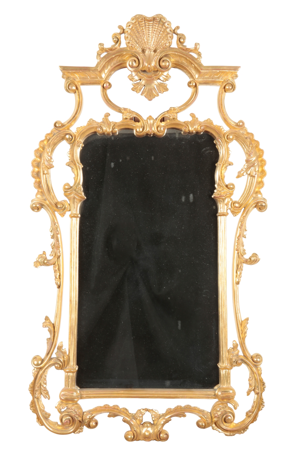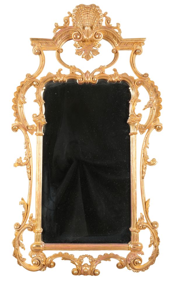 20th century, the rectangular plates within scrolling foliate surrounds, the architectural pediments centred by carved shells, 102cm high x 57cm wide (2)
