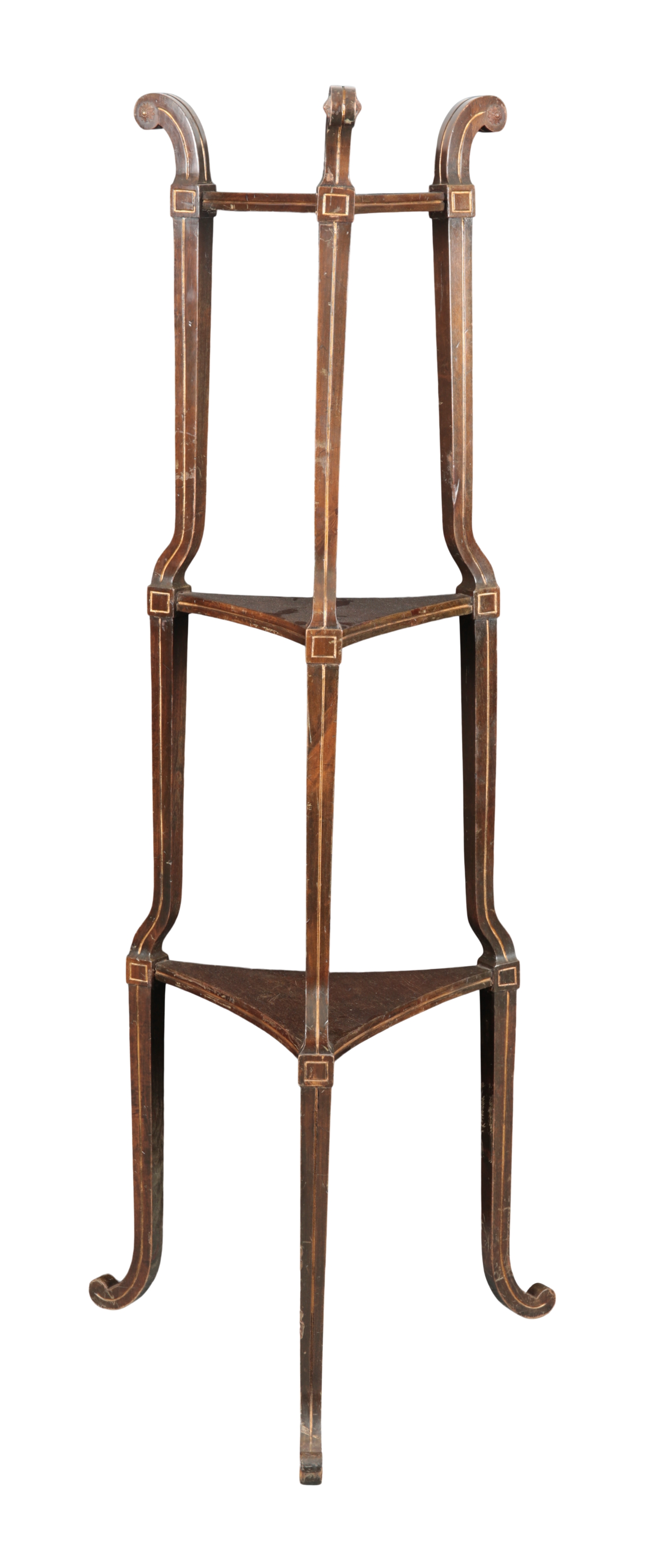 the three graduated triangular tiers on moulded supports affixed with floral paterae to the tops and terminating on scrolled feet, 153cm high x 61cm wide