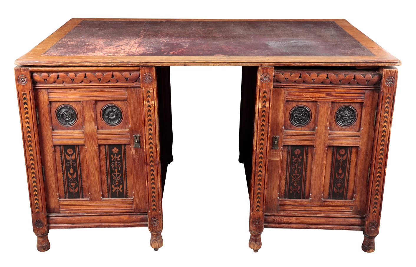 late 19th/early 20th century, the tooled leather top on twin pedestals fitted with cupboards to both sides opening to three drawers, the doors carved with floral roundels and decorated with foliate inlay, the sides of the pedestals also carved in relief with stylized flora, on turned feet, 79cm high x 140cm wide x 97.5cm deep