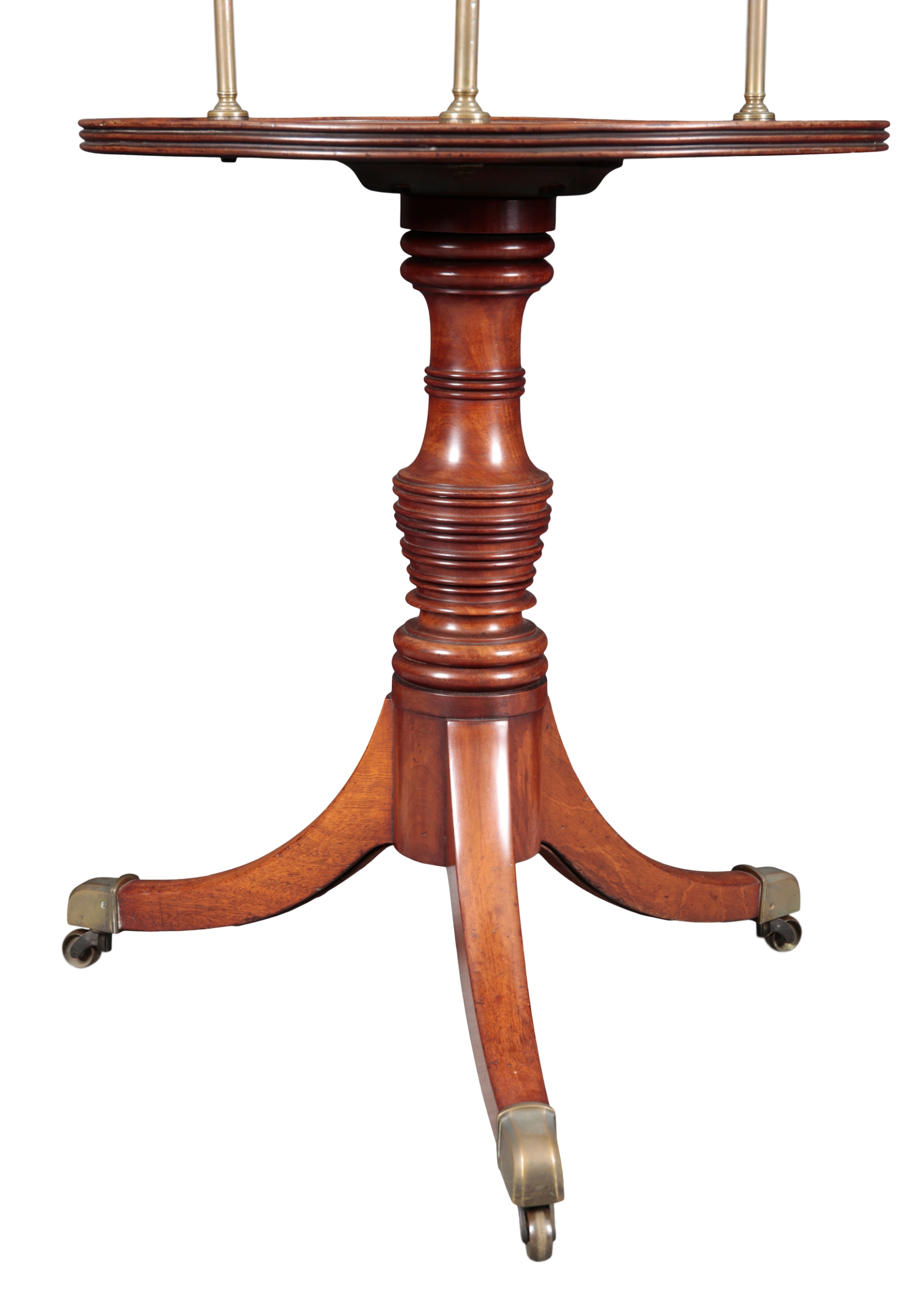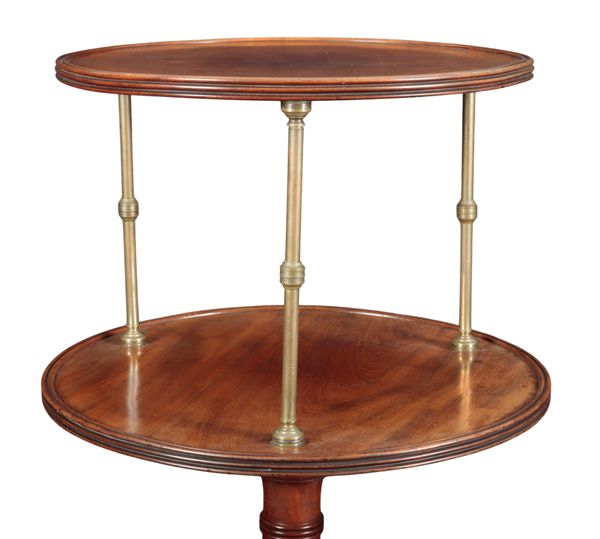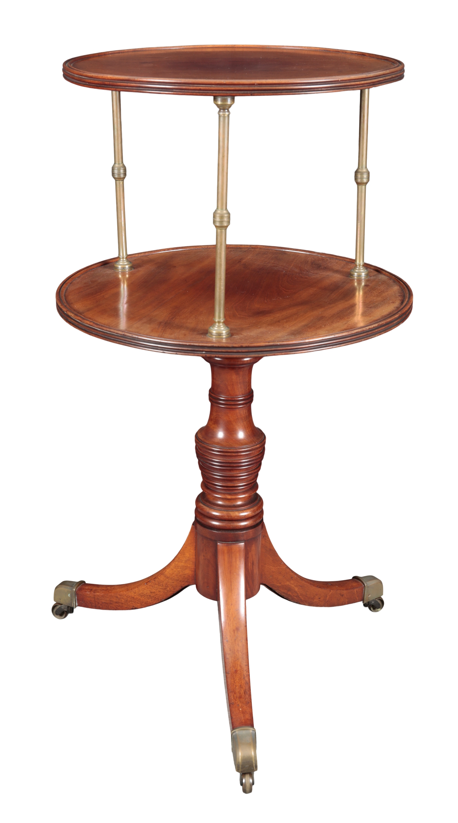 stamped '1105' to the underside, with two graduated tiers on turned brass columns, the tripod base terminating on brass toes and castors, 112cm high x 60cm diameter
