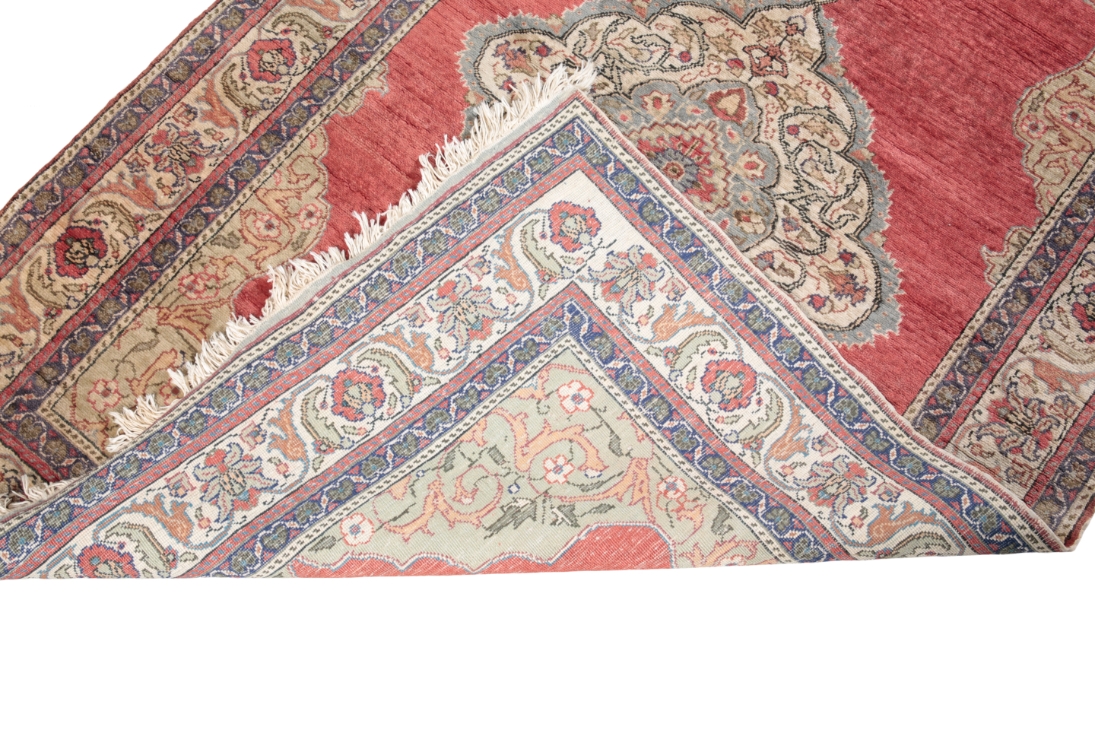 20th century, the plain red ground decorated with a floral motif within conforming spandrels and borders, 180cm x 118cm