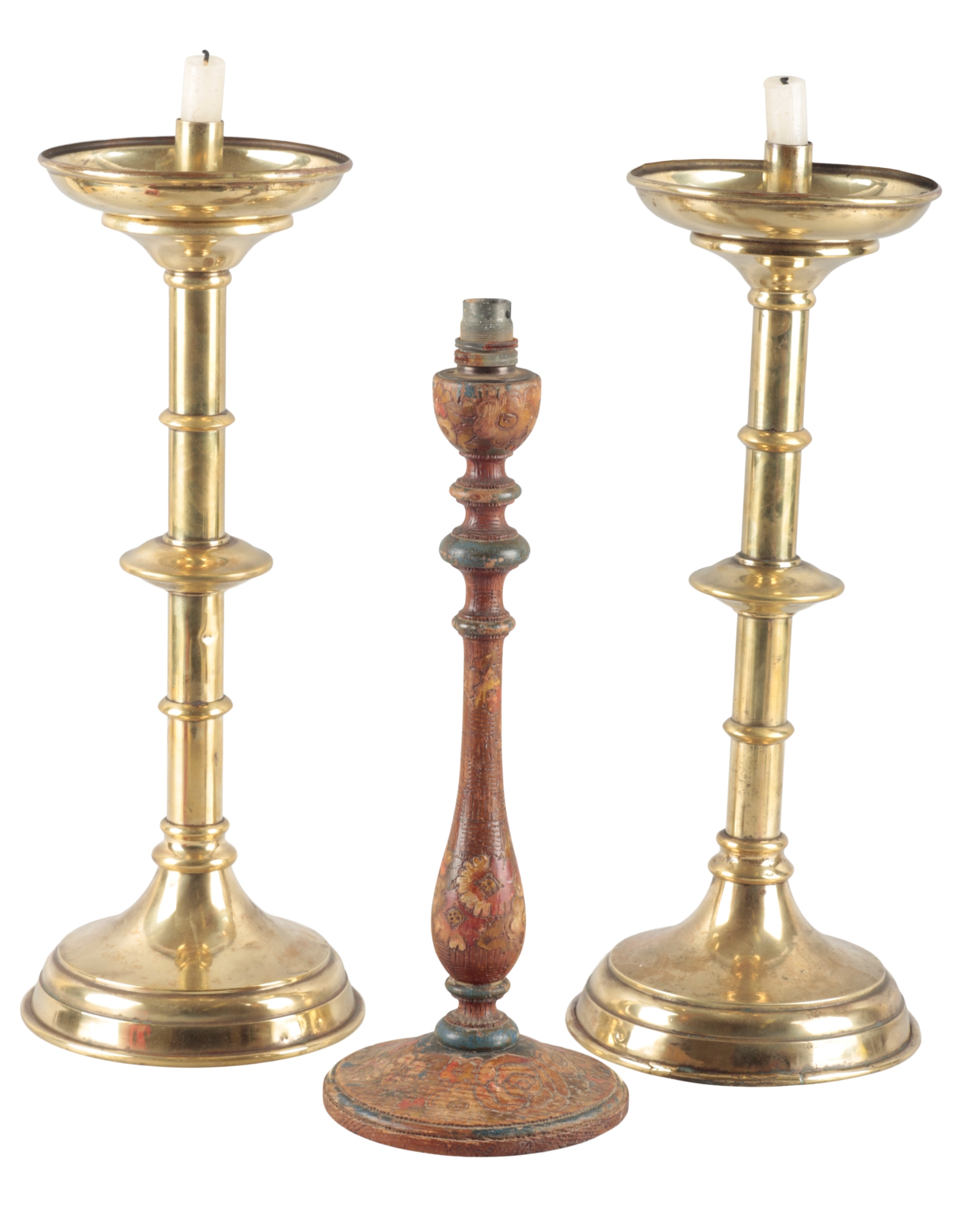 20th century, with wide sconces on turned stems, 47cm high x 20cm diameter; together with a carved and polychrome painted candlestick, later fitted for electricity, 38cm high (3)