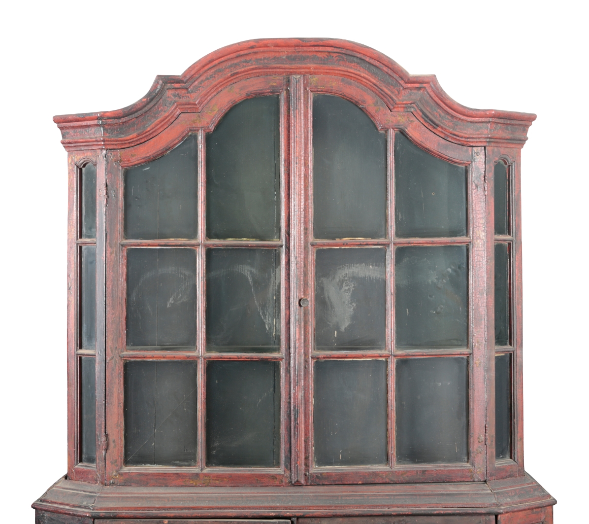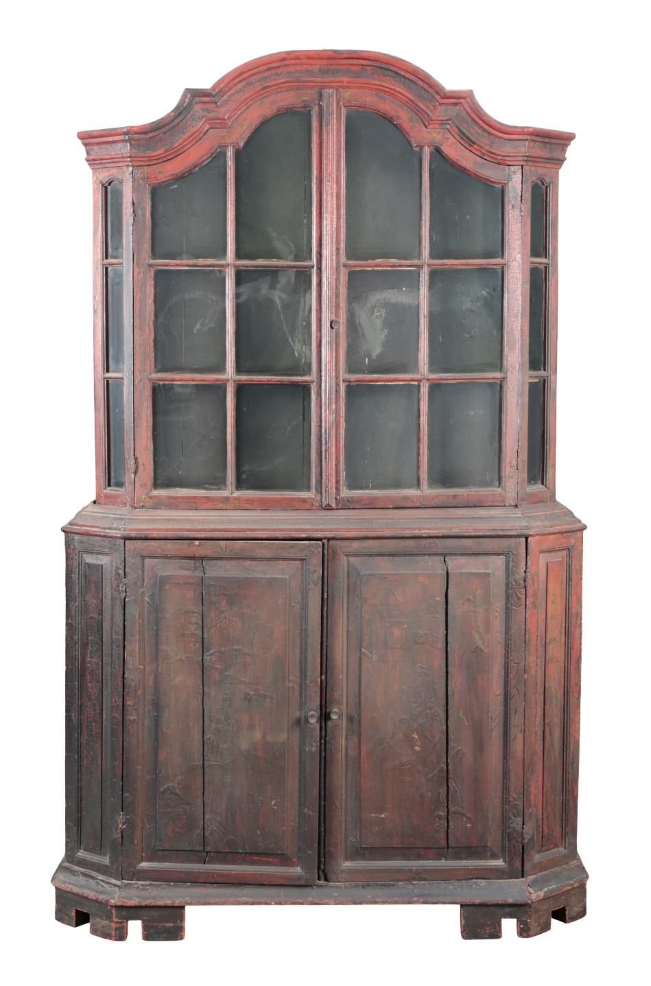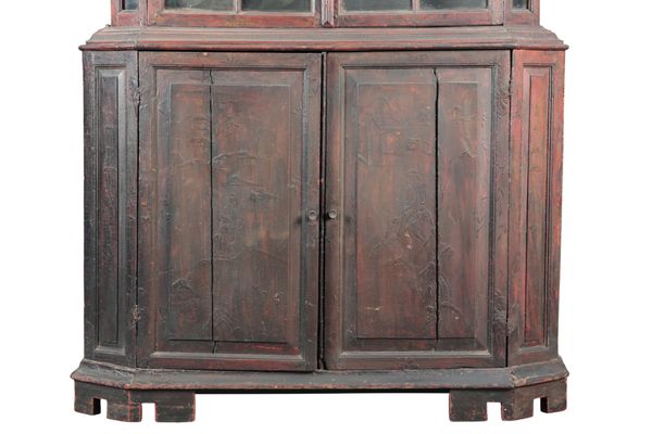 A RED LACQUERED LIBRARY BOOKCASE OR DISPLAY CABINET
