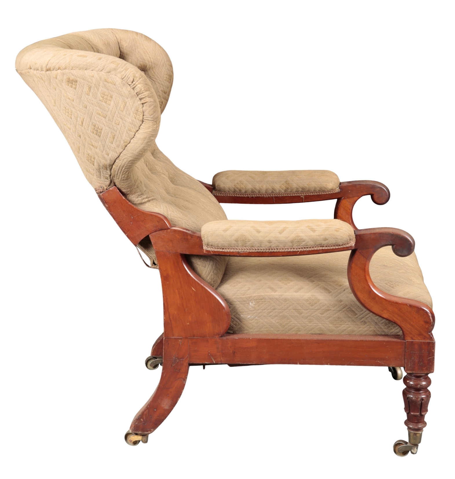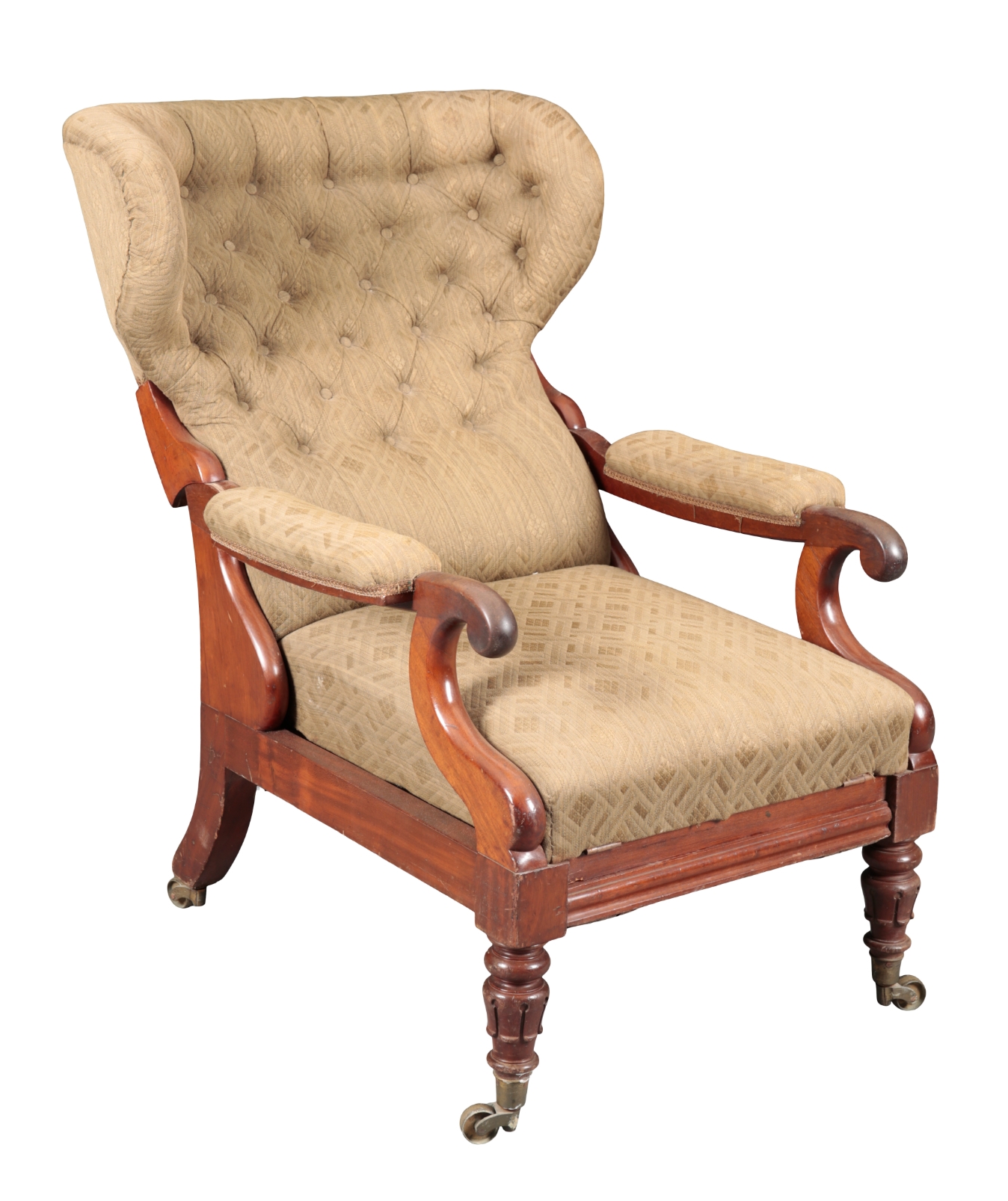 A VICTORIAN MAHOGANY 'SELF-ACTING' RECLINING WING ARMCHAIR BY GEORGE MINTER OF LONDON