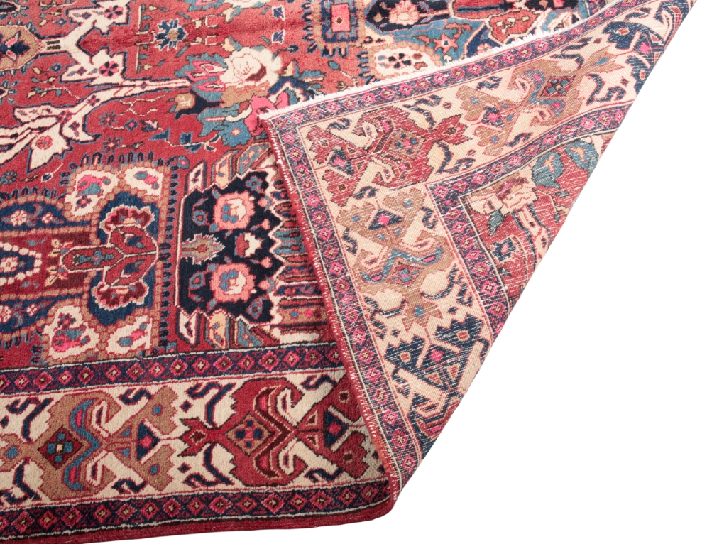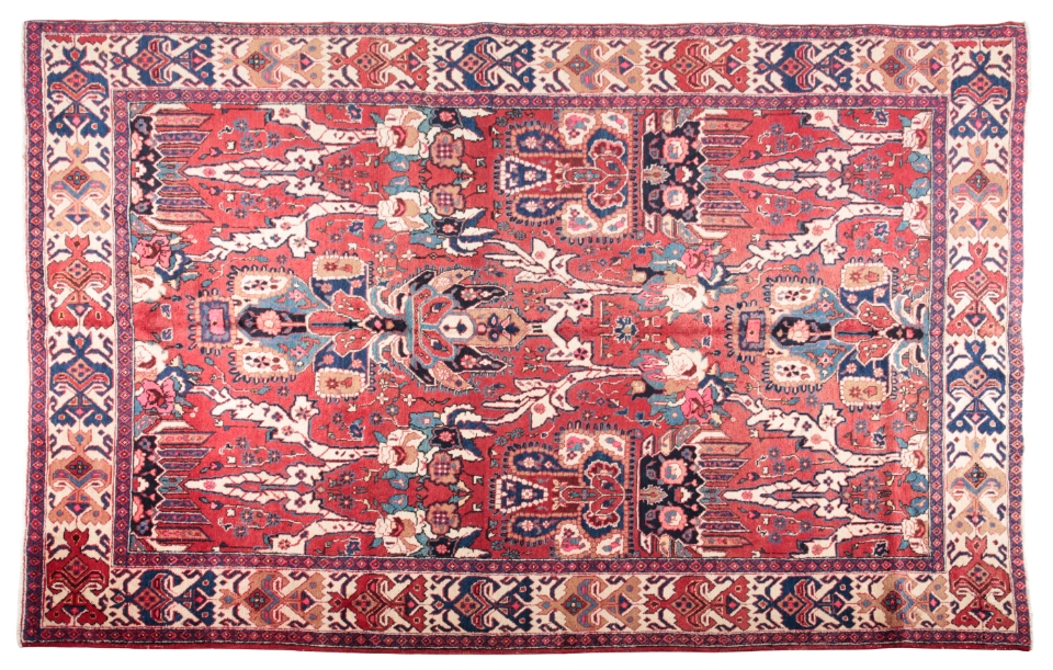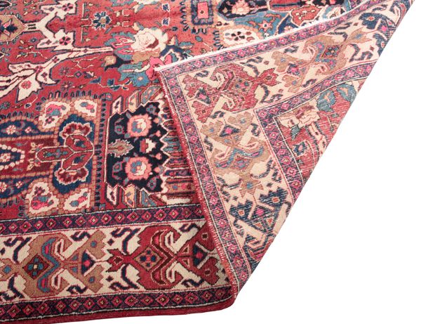 20th century, the red ground decorated with stylised flora, within contrasting white borders, 320cm x 220cm