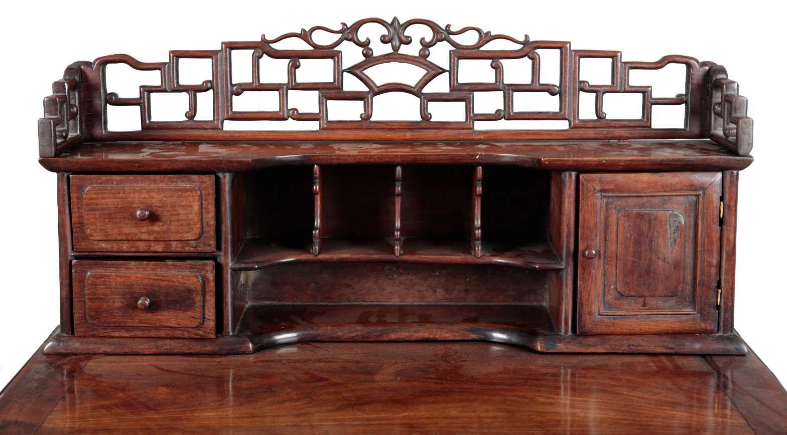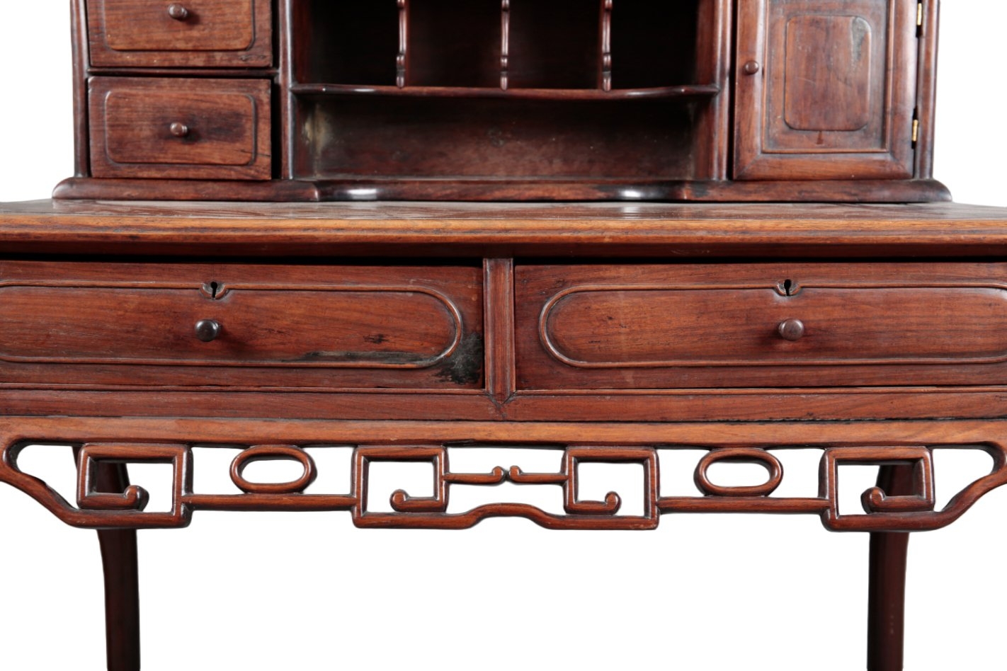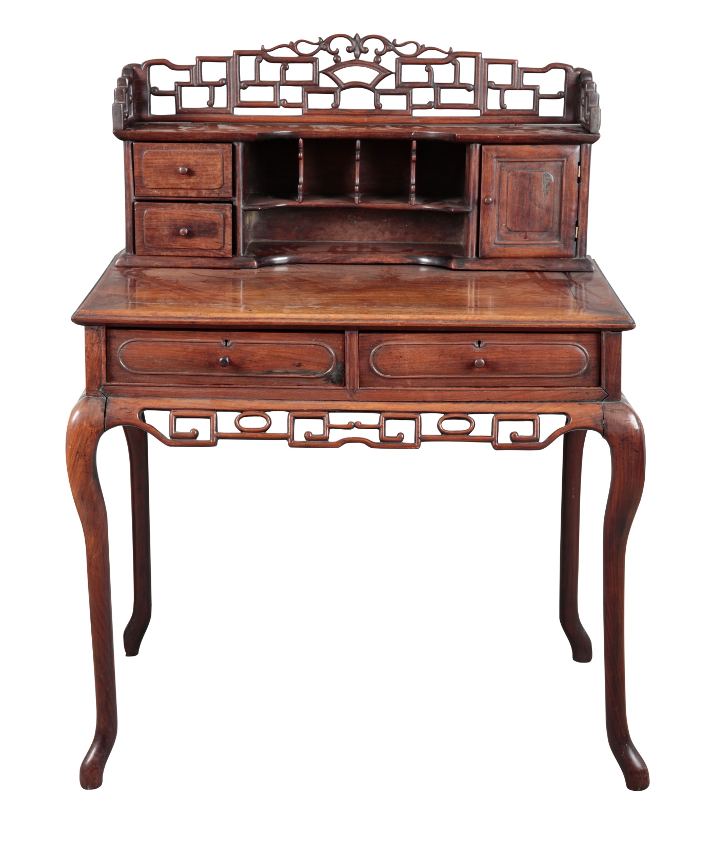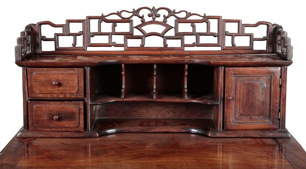late Qing dynasty, the raised superstructure with a pierced fretwork gallery over pigeonholes, short drawers and a cupboard, the base with two short drawers over a conforming apron, on slender shaped legs, 121cm high x 90cm wide x 55cm deep