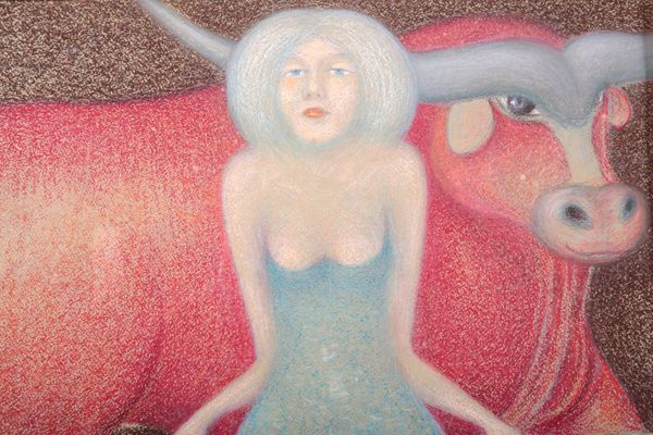 depicting a lady playing piano and a bull, pastel, 38.5cm x 49cm The collection of Cefyn Embling-Evans.