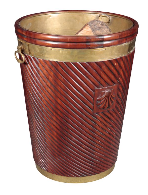A LARGE GEORGE III STYLE MAHOGANY AND BRASS BOUND LOG BUCKET