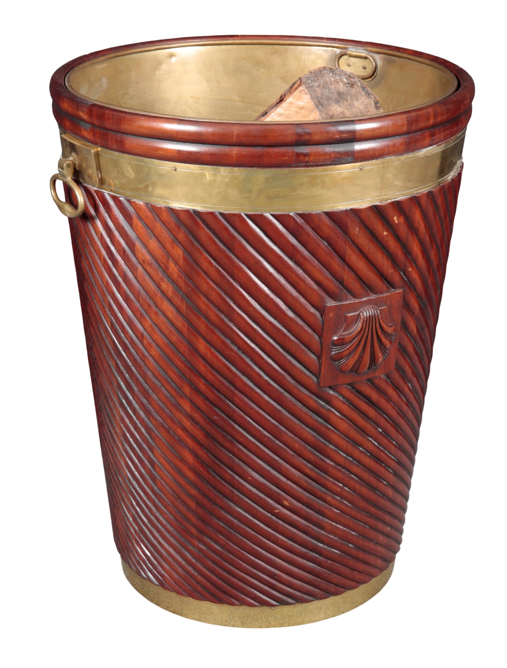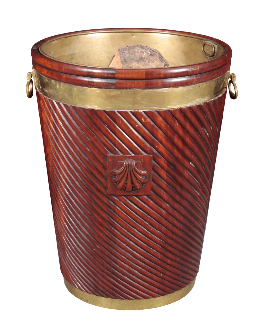 the wrythen moulded body with applied scallop shell appliques and brass handles either side, the interior with a riveted brass liner, 66.5cm high x 55.5cm diameter