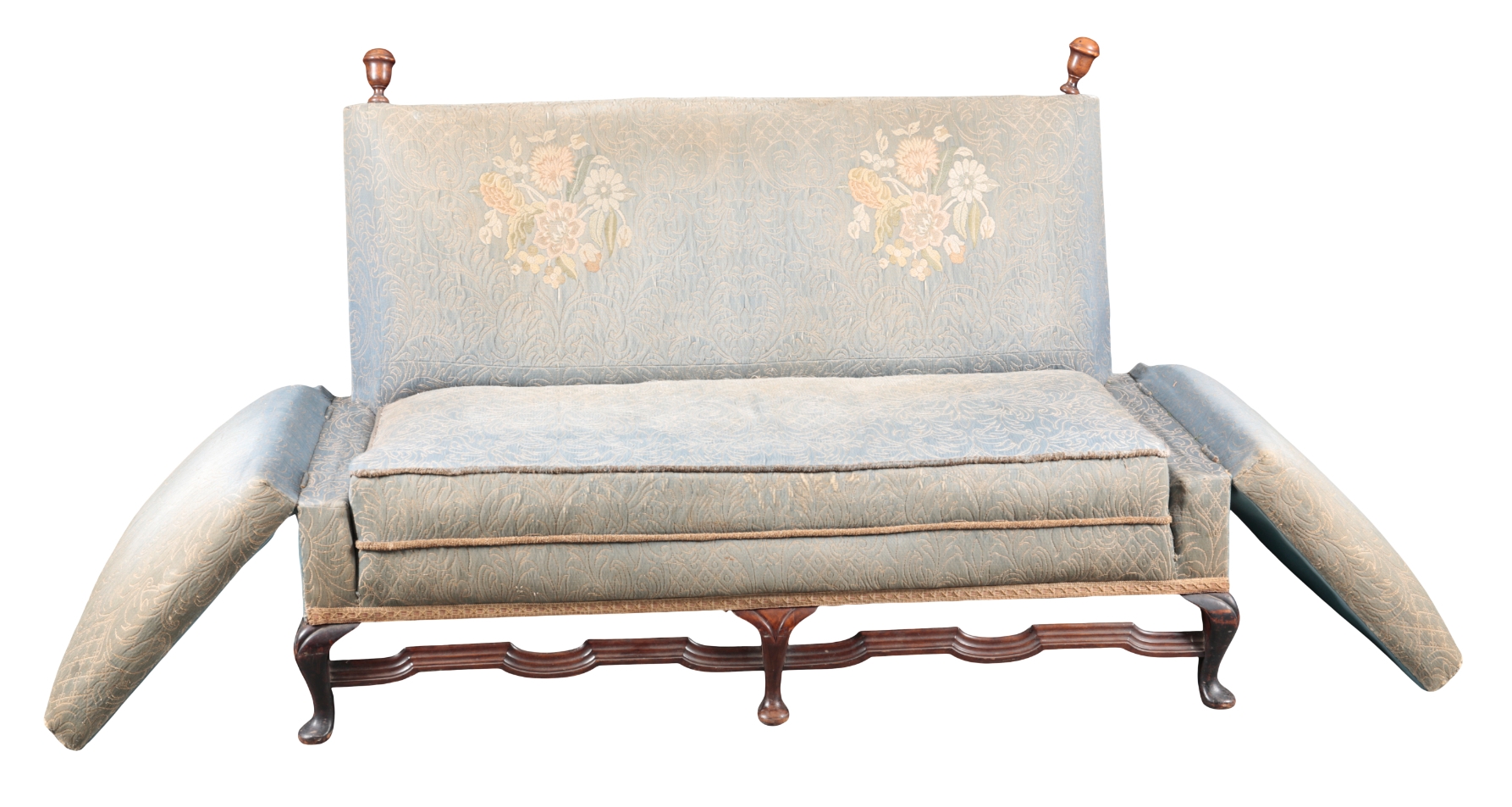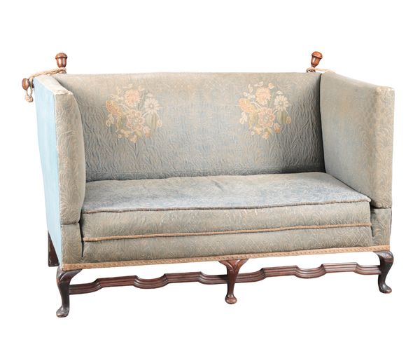 the square back and drop ends with embroidered stuffed covers, on short cabriole legs joined by a shaped stretcher, 105cm high x 156cm wide x 82cm deep