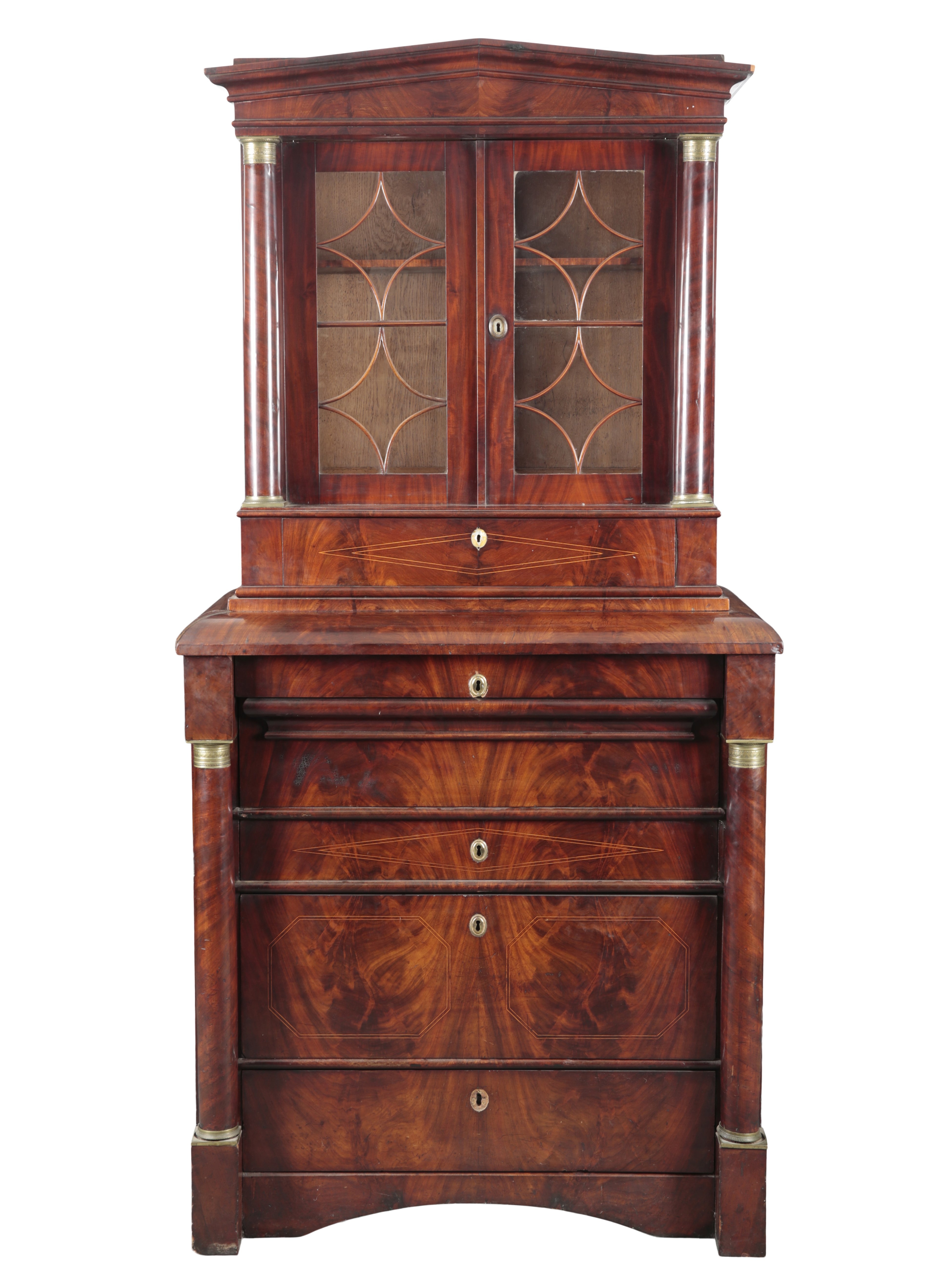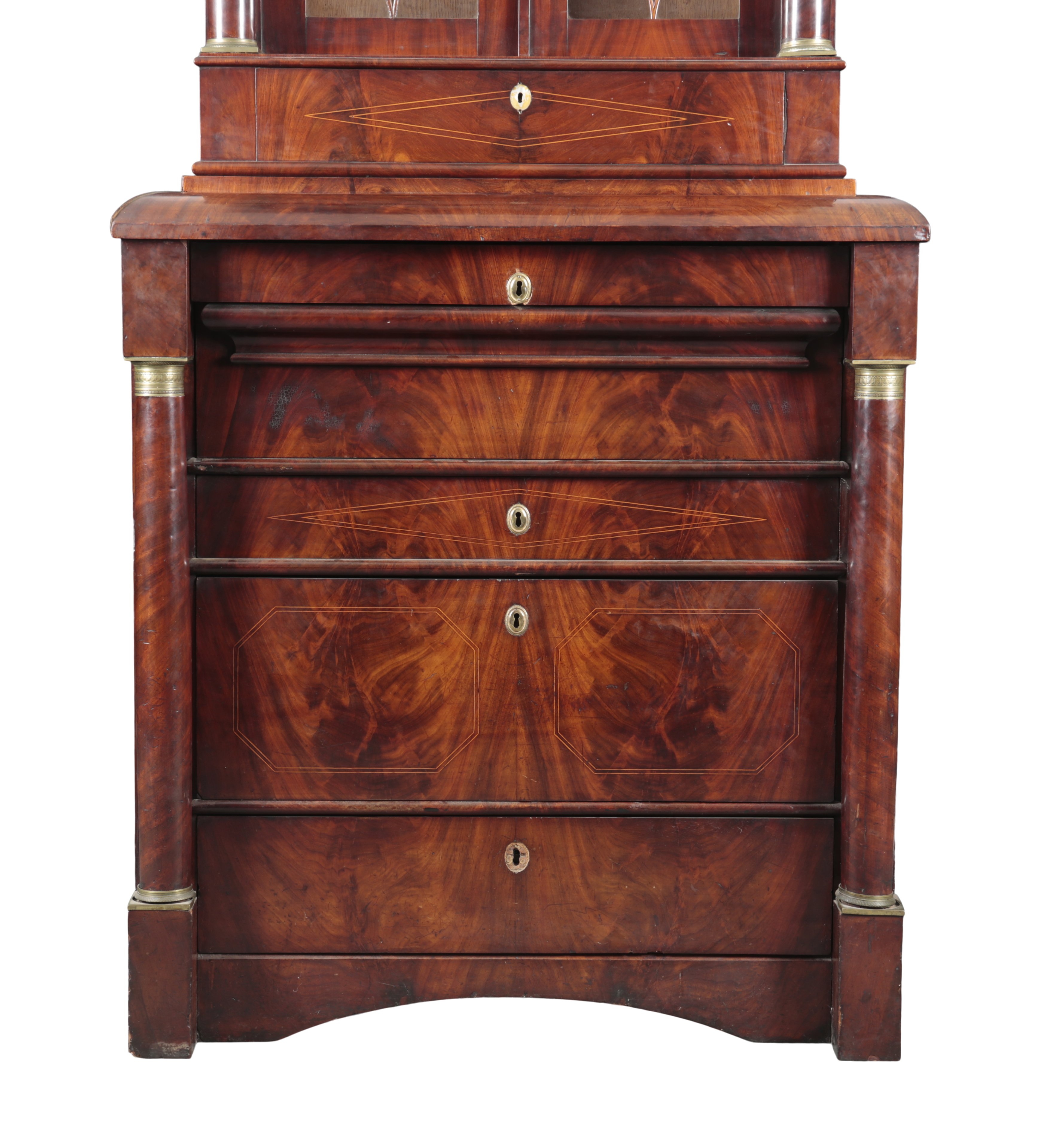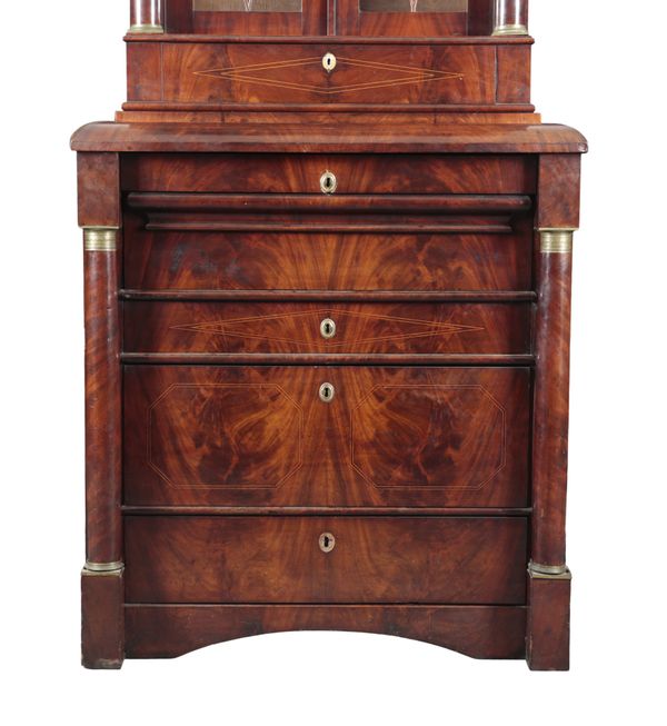 early 19th century, the upper section with an architectural flattened arch pediment over glazed doors flanked by columns and a single inlaid drawer, the base with four long similarly inlaid drawers, 204cm high x 101cm wide x 57cm deep