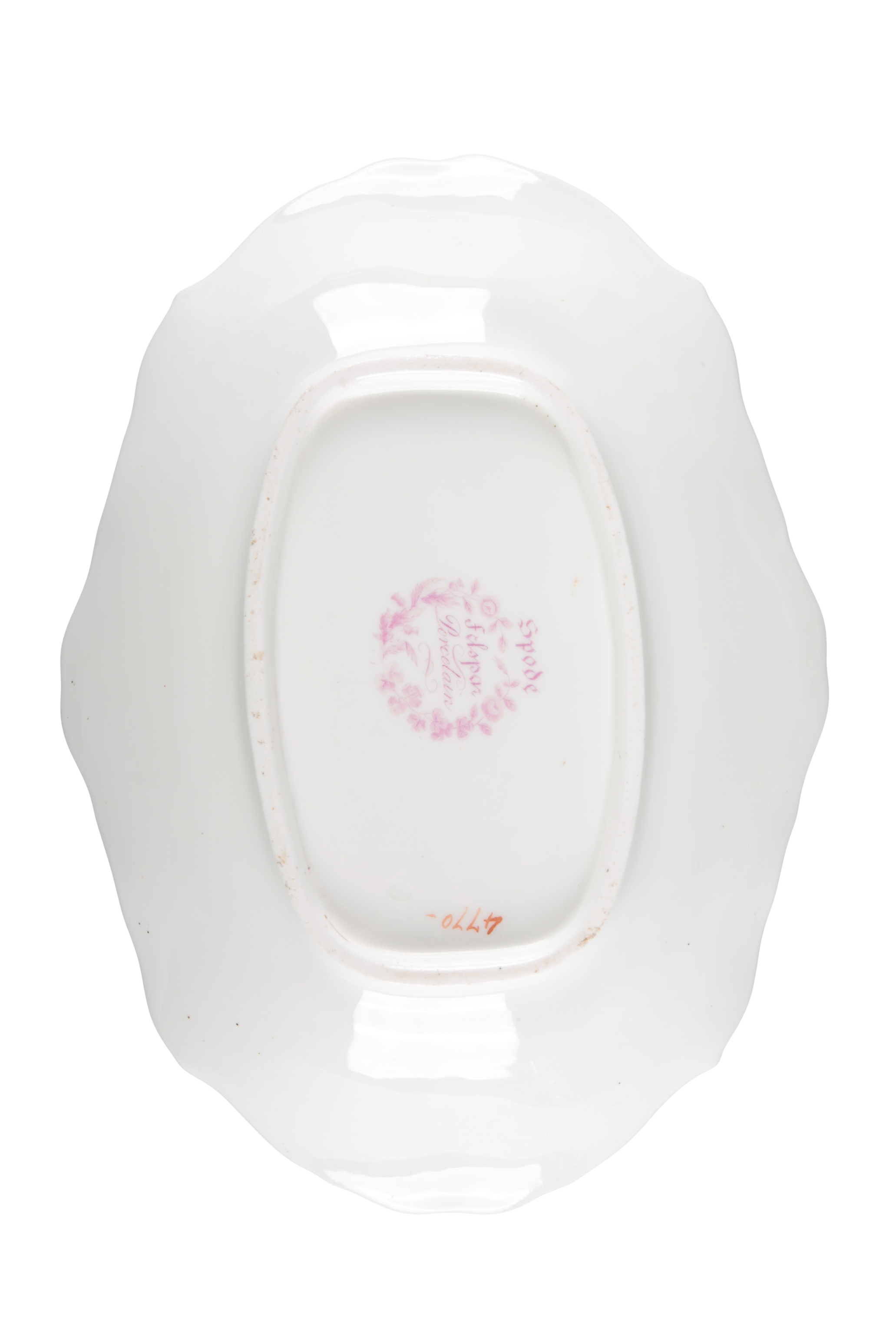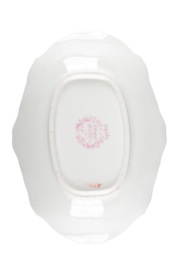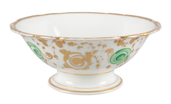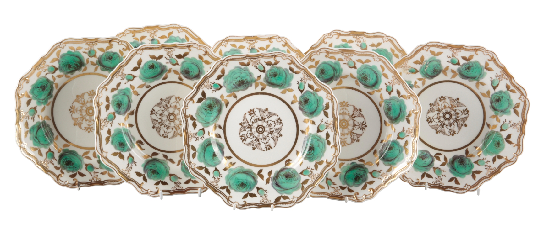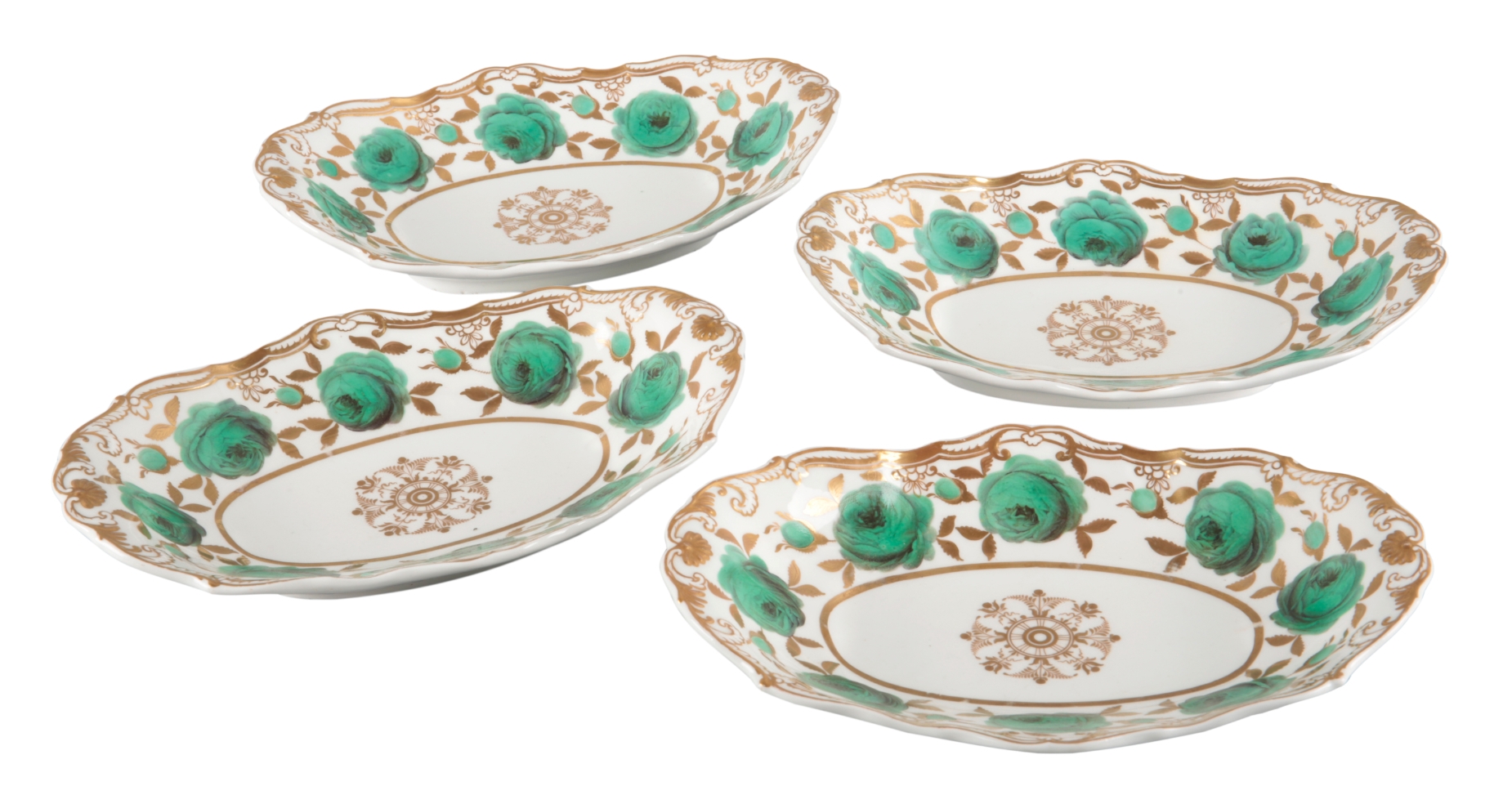 marked to the base, pattern 4770, decorated with green roses and gilt foliage, comprising four serving bowls, 28cm wide, and eight plates, 23cm wide; together with a similar bowl, 21cm diameter (a lot)