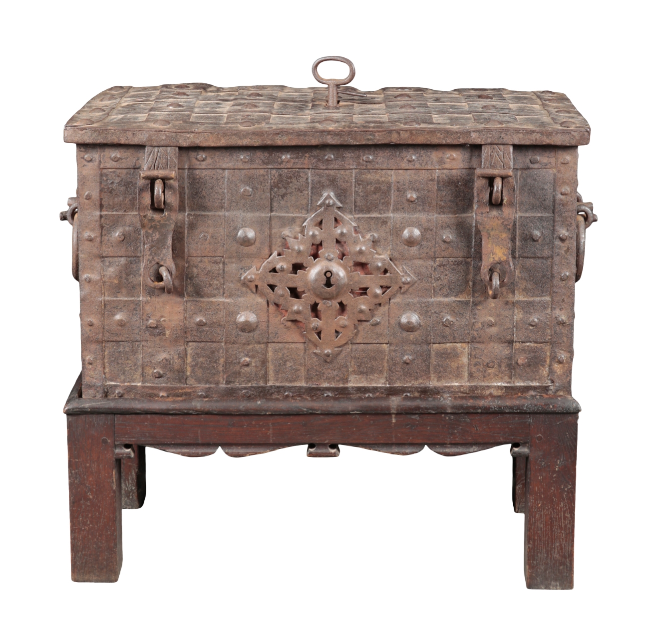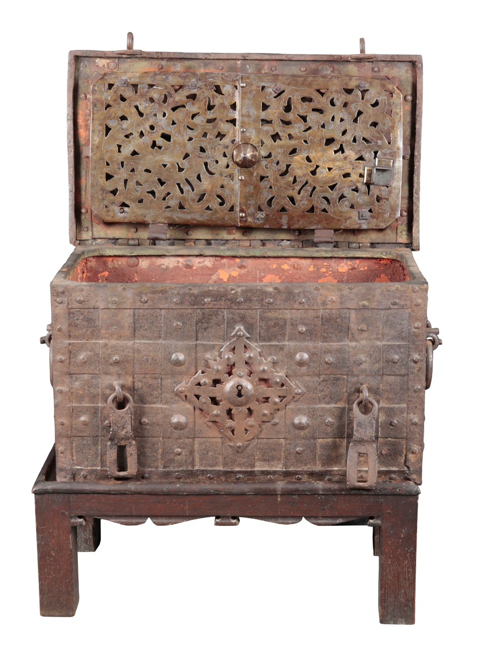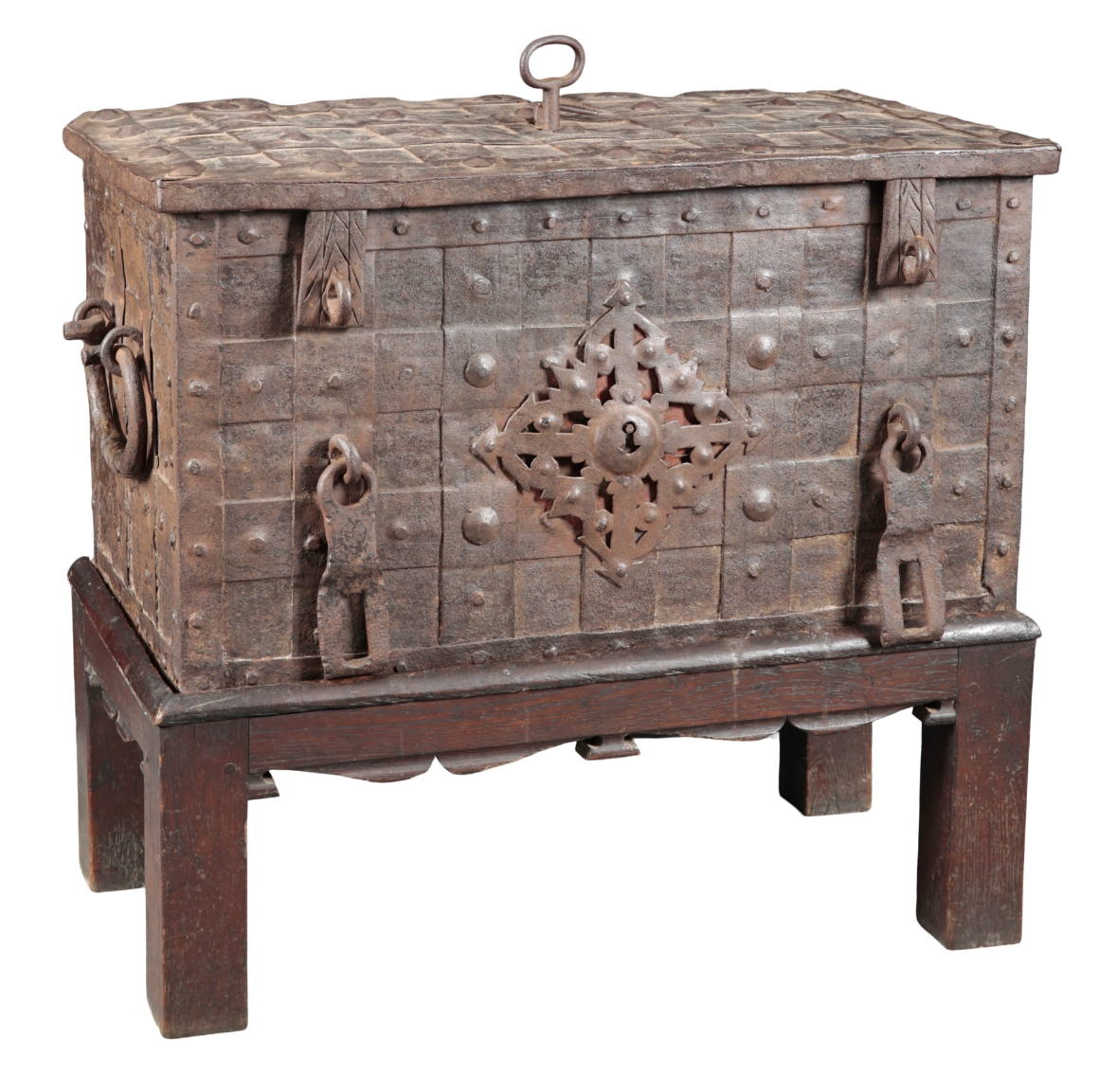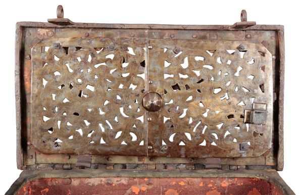 17th century, Nuremberg, the strapwork and rivet constructed chest with a hinged lid opening to an interior fitted with a further locking box, the pierced steel lock plate depicting two mermaids within scroll work detail, a fretwork escutcheon to the front, iron rope twist swing handles to the sides, 44cm high x 81cm wide x 45cm deep, on a later associated stand, 30cm high