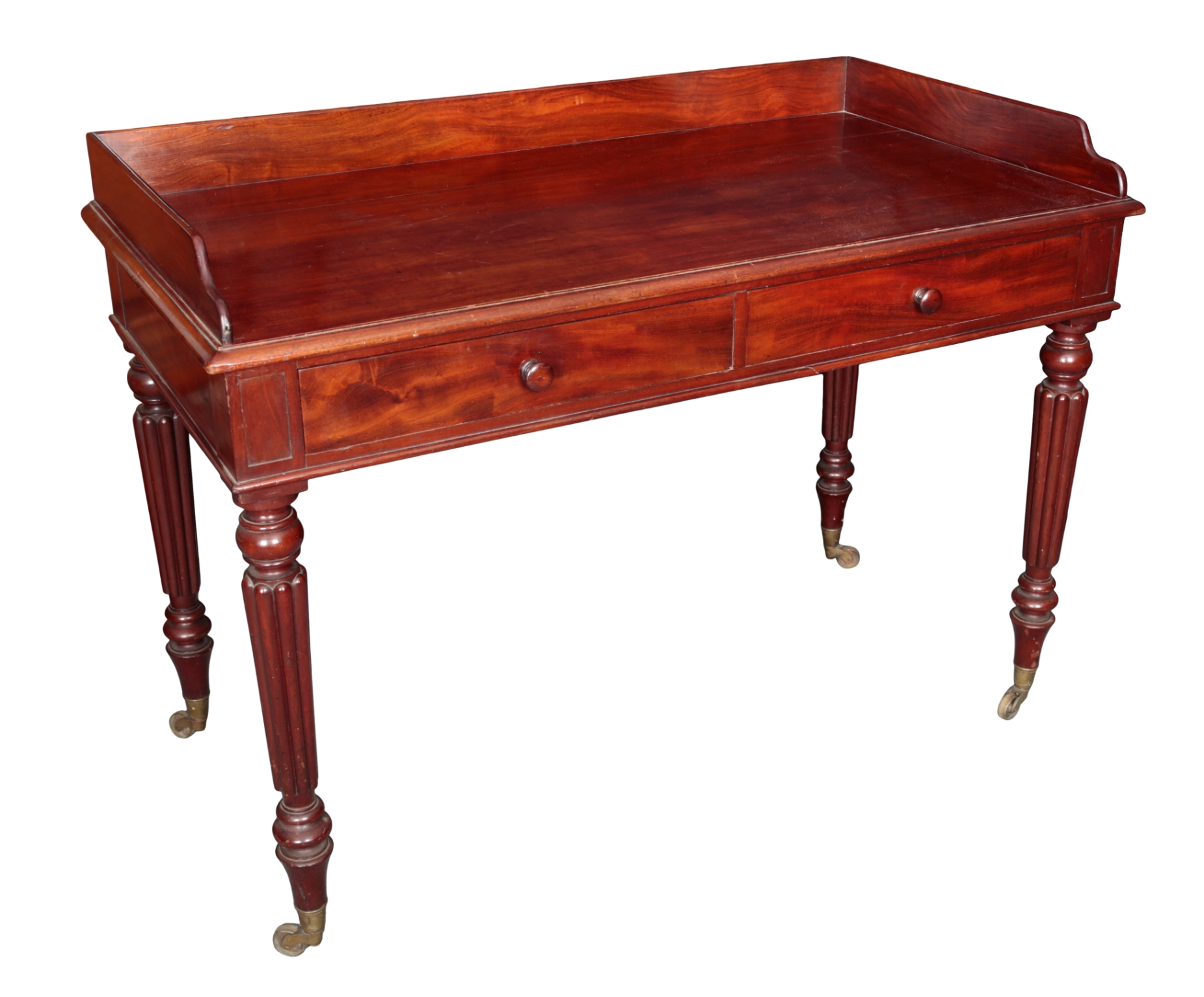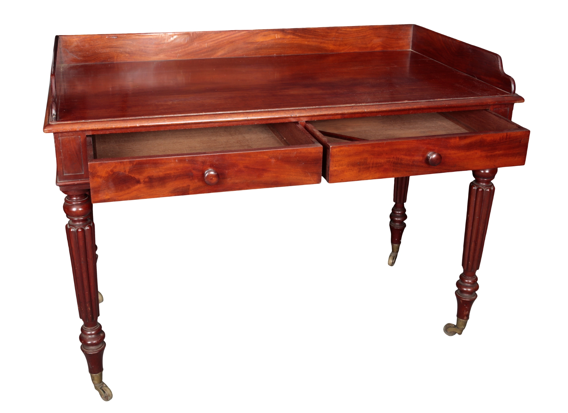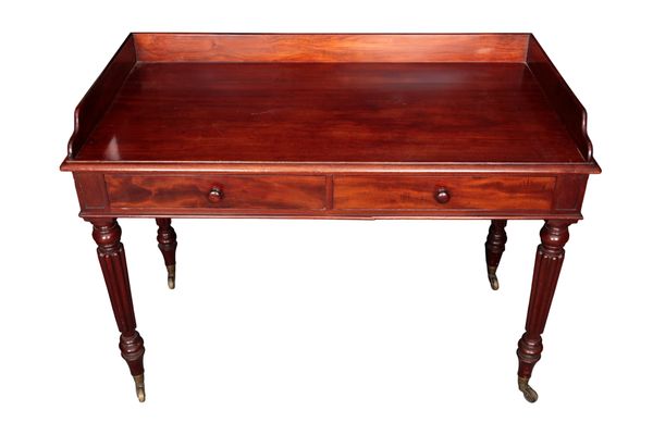 the moulded rectangular top with a three-quarter gallery and two frieze drawers, on turned and reeded legs terminating in brass Cope & Collinson castors, 84cm high x 117cm wide x 61cm deep
