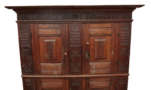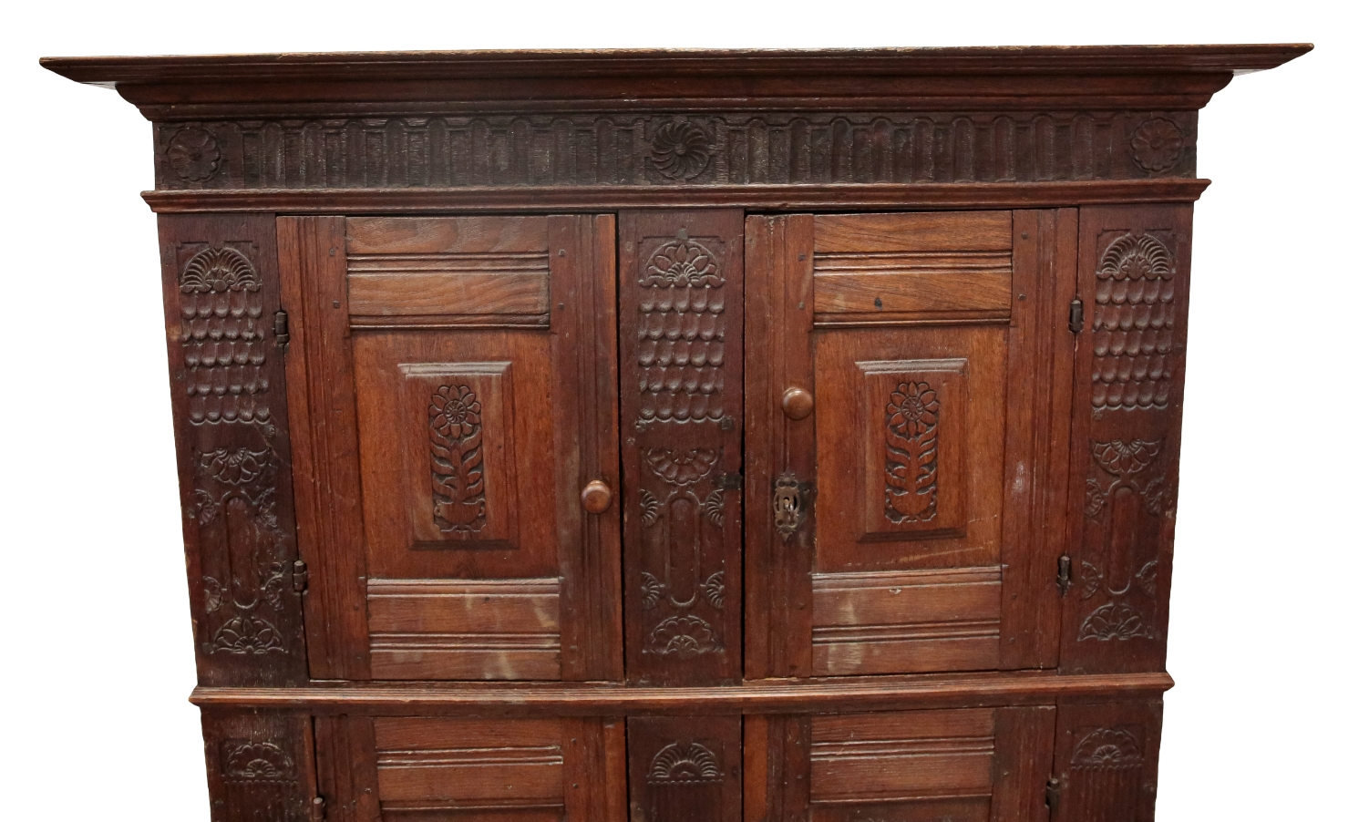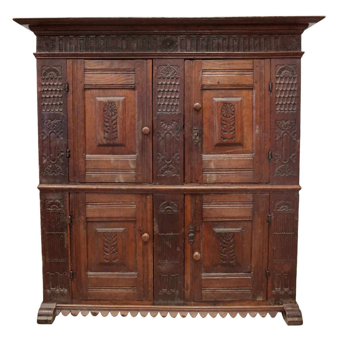 18th century, in the Westphalian taste, carved decoration throughout, the four doors opening to reveal a shelved interior, 160cm high x 150cm wide x 56cm deep