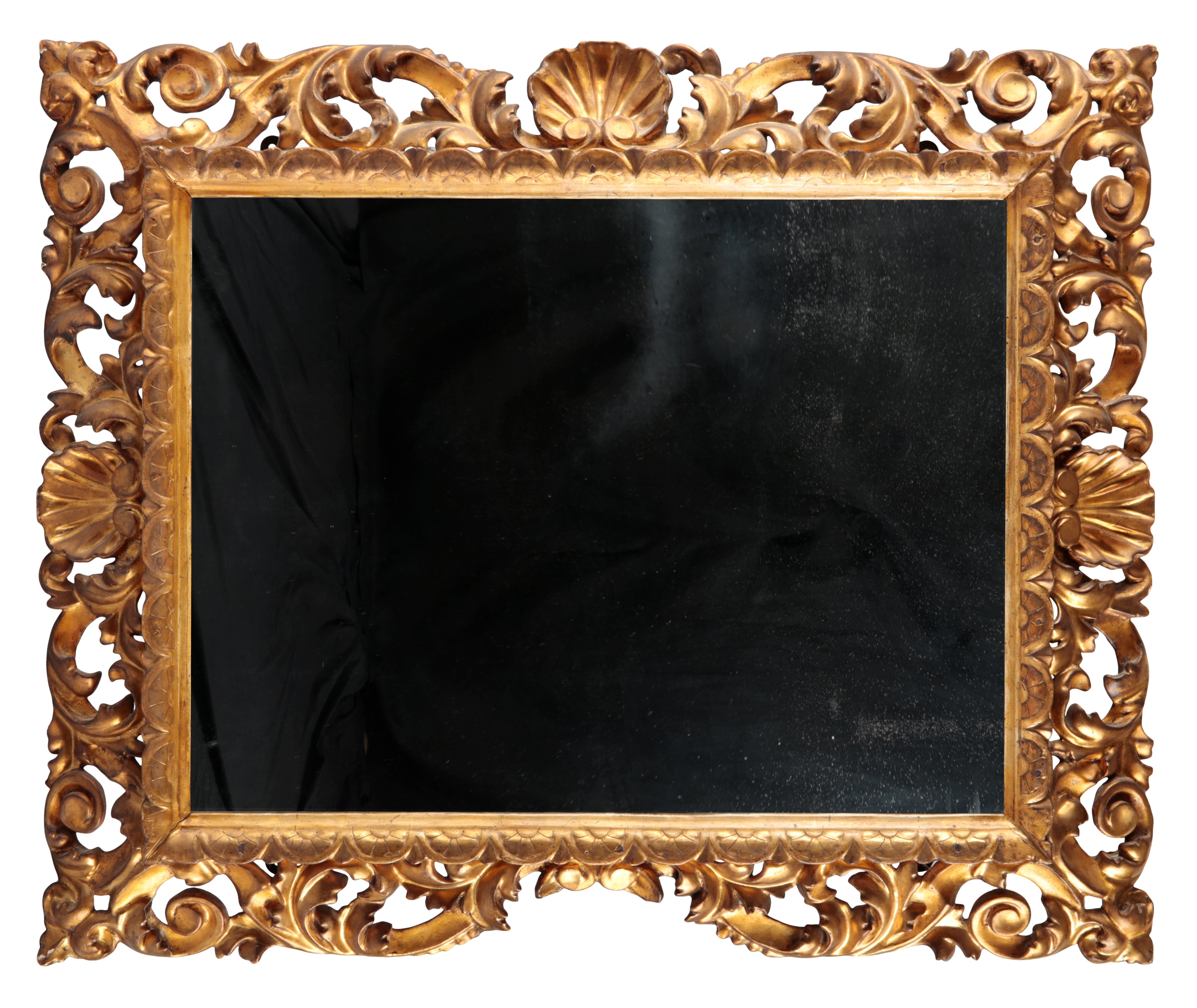19th century or later, the bevelled rectangular mirror plate set within pierced scrolling acanthus leaf surmounted and flanked by scallop shells, 58cm high x 78cm wide