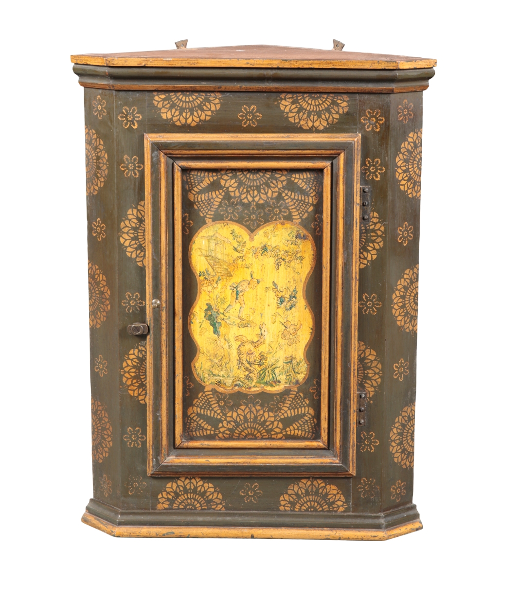 A CONTINENTAL POLYCHROME PAINTED PINE CORNER CUPBOARD