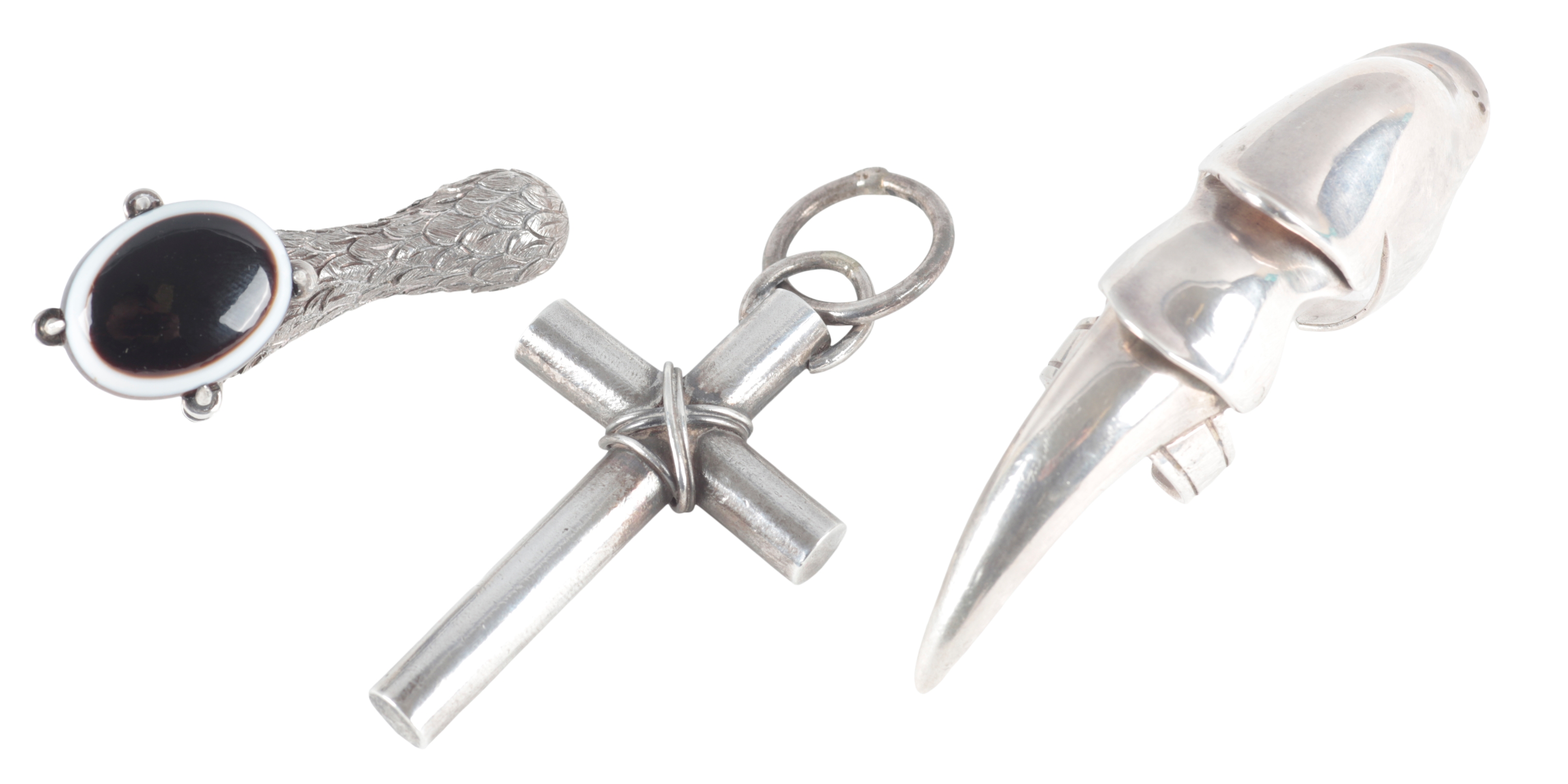Edinburgh, 1998, the cross 6cm high; together with a white metal 'grouse claw' kilt pin, 5.5cm long; and a similar nail claw ring, 8cm long (3)