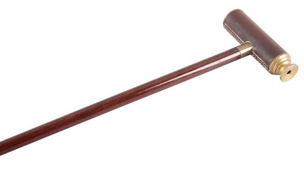 the three-drawer scope on an adjustable tripod base, 14cm long closed, the stand 40cm high at its shortest, 107cm high at its tallest; together with a telescopic walking stick by Stanley of London, 91cm high (2)