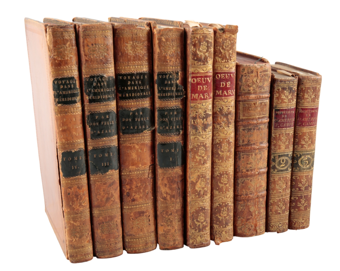 volumes 1-4, published by Dentu, Paris 1809, gilt tooled brown leather bound; together with Campe: ‘La Decouverte de L’Amerique’ volumes 2 and 3, 1784; and three other antiquarian French books (9)