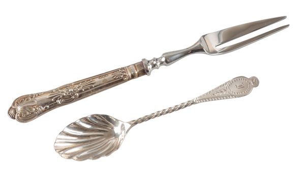 by Hawksworth, Eyre & Company London, 1891, with scalloped bowls and complete with matching sugar tongs, 2 tr. ozs combined, in original fitted case; together with a set of George VI silver handled forks, Sheffield 1940, cased (2)