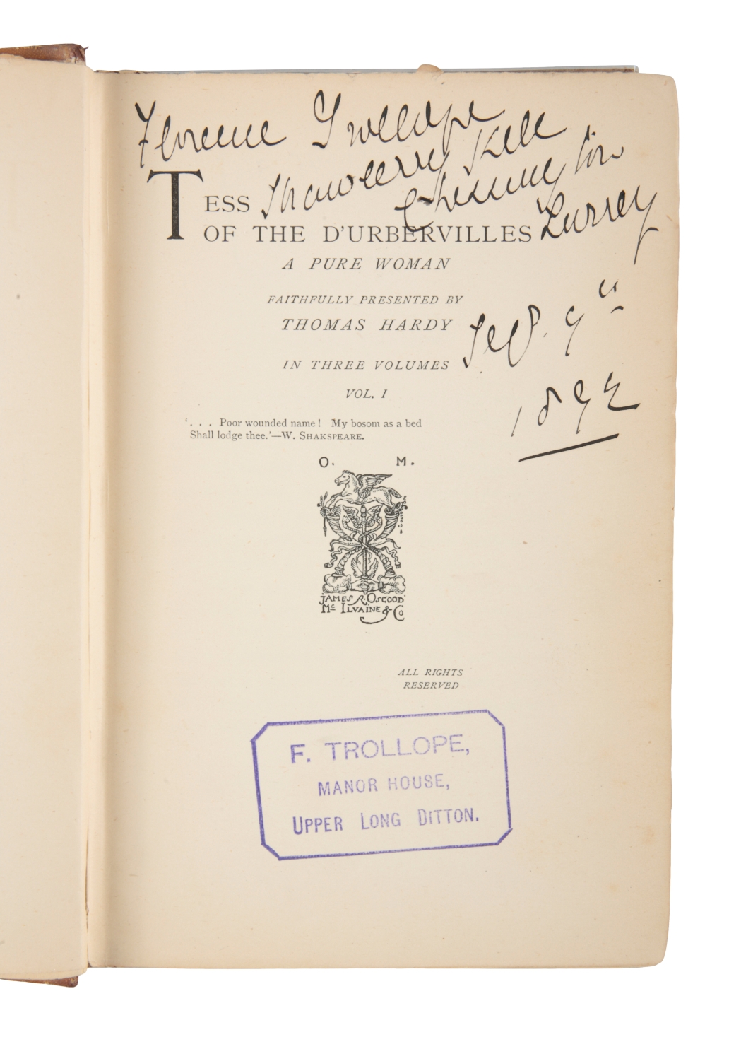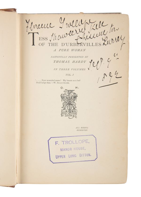 Printed in the week of 29 November 1891 in an edition of 1,000 copies, Tess proved an immediate success and a second issue of 500 copies was published in February the following year. In addition to the dates (1891) on the verso of the title pages, the first issue can be distinguished by a number of textual points, including: vol. I, p. [v], line 12, "have it said"; vol. II, p. 58, line 4, "Valasquez"; p. 155, line 21, "seampstress"; p. 199, "Chapter XXV" for XXXV; Vol. III, p. 112, line 24, "are ye doing". As the three-decker format was chiefly adopted for sale to lending libraries, copies retaining the original cloth in collectable condition are scarce.