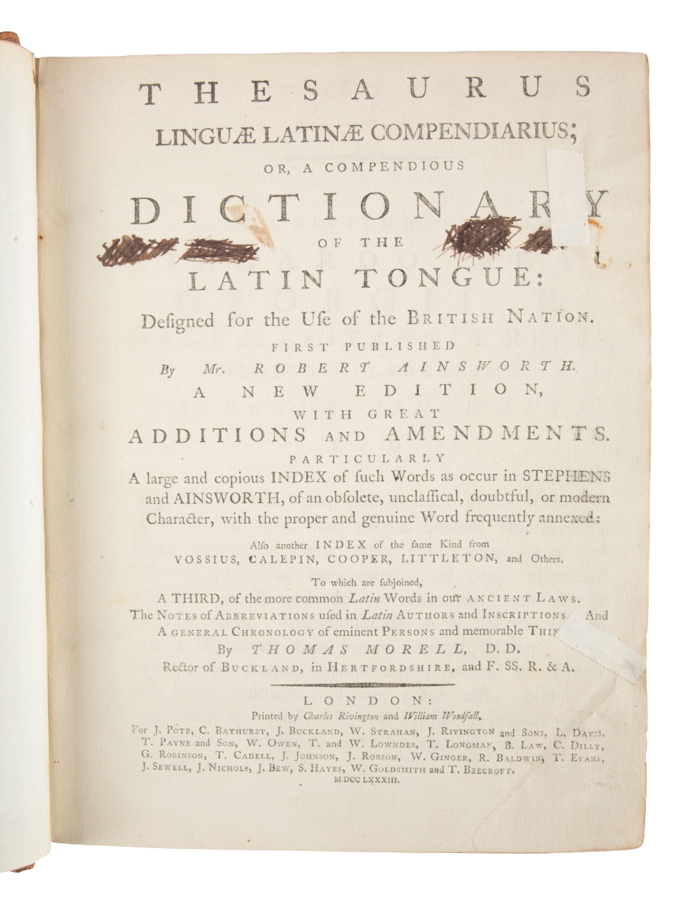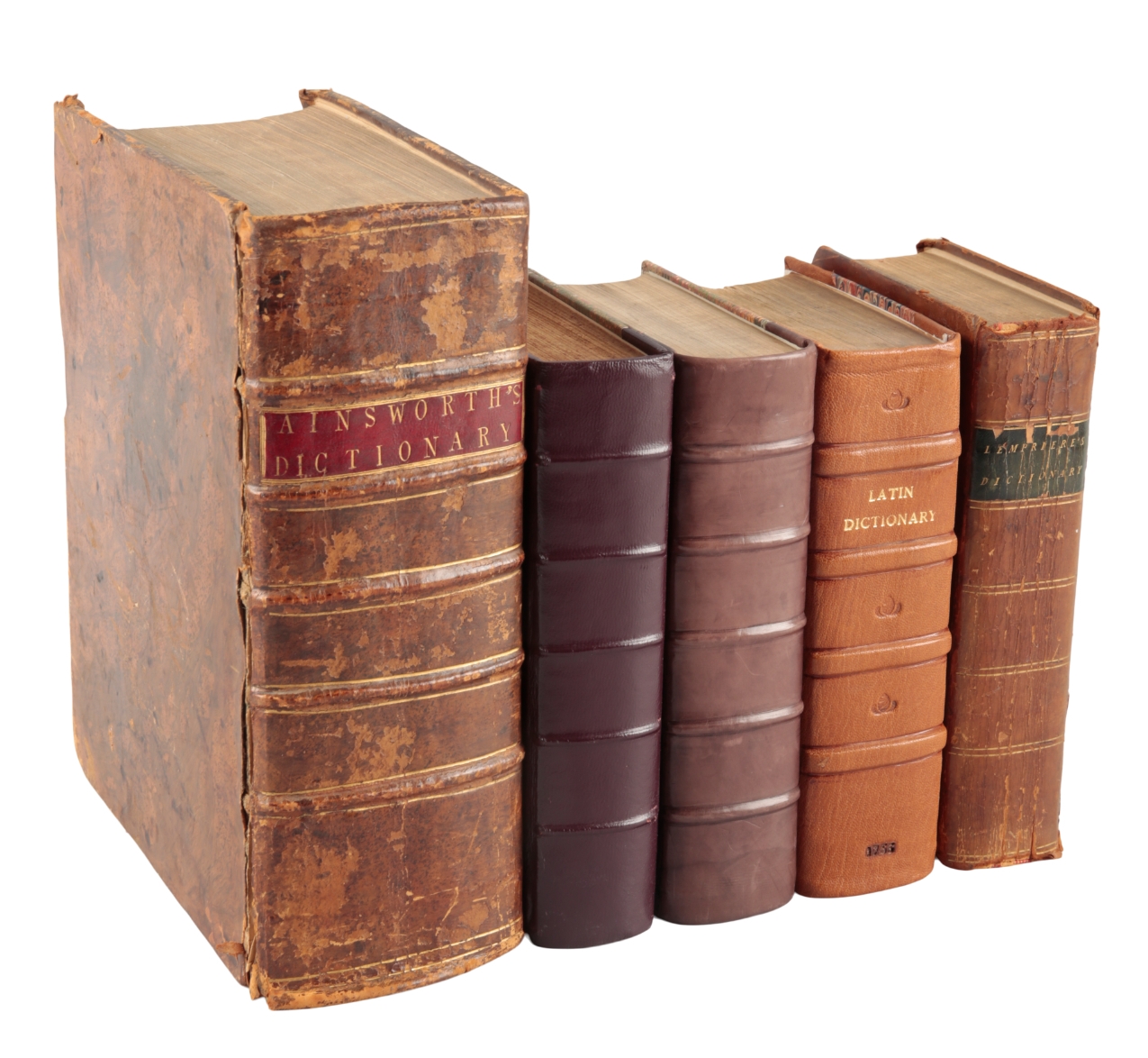 eleventh edition, printed for Brown et al, Edinburgh 1797, rebound half brown leather; together with Ainsworth, Robert - A Dictionary of the Latin Tongue’ new edition, printed for Bathurst et al, 1783, brown leather bound; two other antiquarian Latin dictionaries; and Lempriere, J.: ‘A Classical Dictionary’, fourth edition, London 1801, brown leather bound (5)