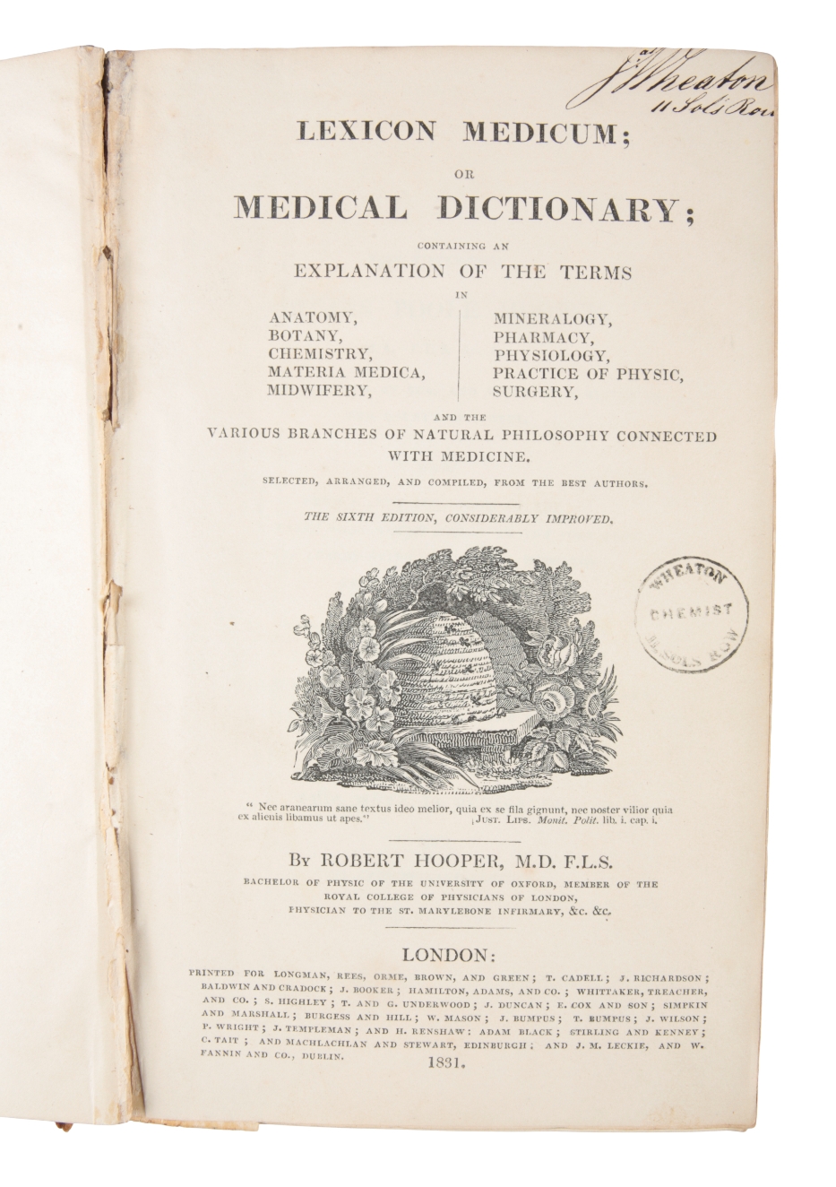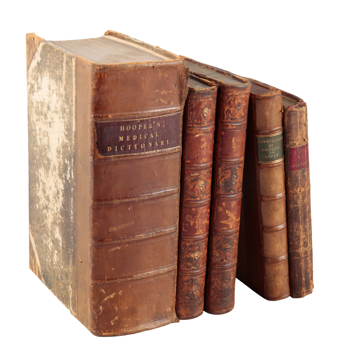 translated by Samuel Shaw, printed for H.D. Symonds, London, brown leather bound with red leather half title, retaining plates; together with Combe, Andrew: ‘The Principles of Physiology’ sixteenth edition, published by Maclachlan and Stewart, Edinburgh 1885, brown leather bound; Hooper, Robert: ‘Lexicon Medicum’, 1831, brown leather bound; and ‘Physic and Physicians’ volumes 1 and 2, 1839, three quarter leather bound (5)