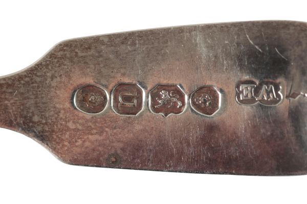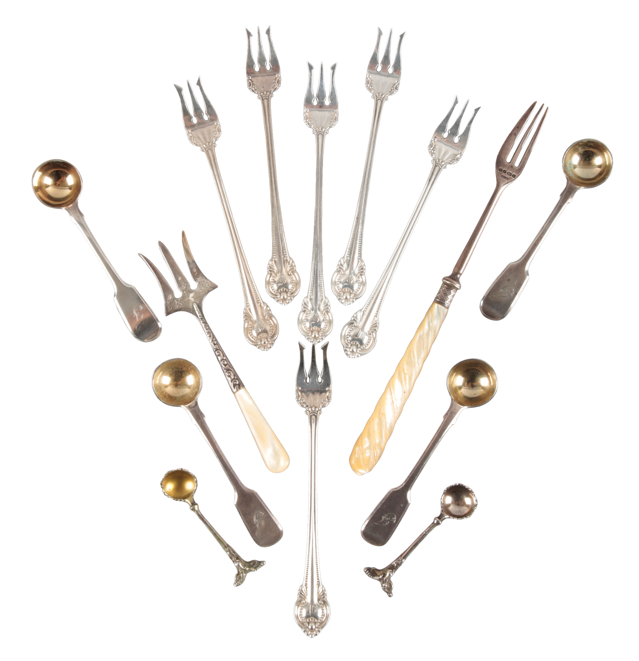 marked "Sterling" and possibly American; together with a set of four William IV silver salt spoons, London 1835; two silver condiment spoons, London 1873, 8 tr. ozs combined; and two silver bladed forks with mother of pearl handles (14)