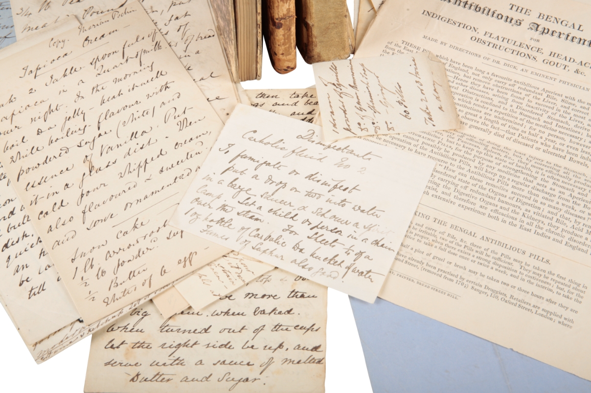 containing handwritten instructions in a variety of hands, including a cure for Dysentry taken from the General Evening Post for Thursday October 17 1780, the volume 21cm x 6.5cm; together with two other similar recipe books (3)