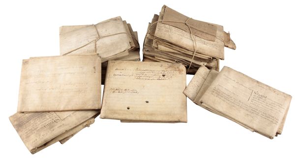 There are approximately 90 vellum documents contained in this lot, together with damaged vellum scraps, paper documents, letters, auction catalogues and other ephemera