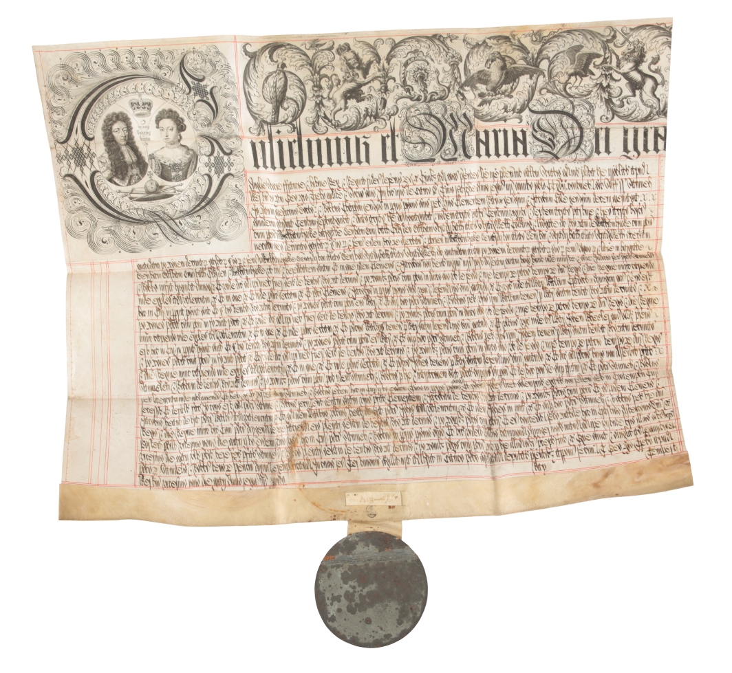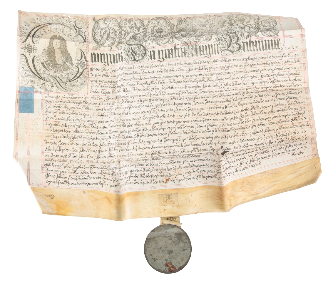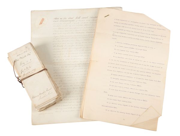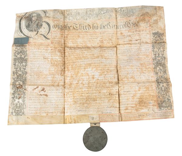 comprising a good number of manuscripts and documents on vellum,17th century and later, including a William and Mary manuscript bearing a double engraved portrait to the upper left and a seal (broken), a similar George I manuscript with a portrait upper left and a seal (damaged), a George III manuscript with portrait upper left and a seal, a large group of further legal documents, relating to the Wyatt and Wainwright families amongst others, to include property deeds, lease agreements, loans, statements, wills and probates, two family trees, for the Wainwright and Wyatt families, as well as a collection of 19th and 20th century letters, contained in a metal and a wooden chest (a lot)