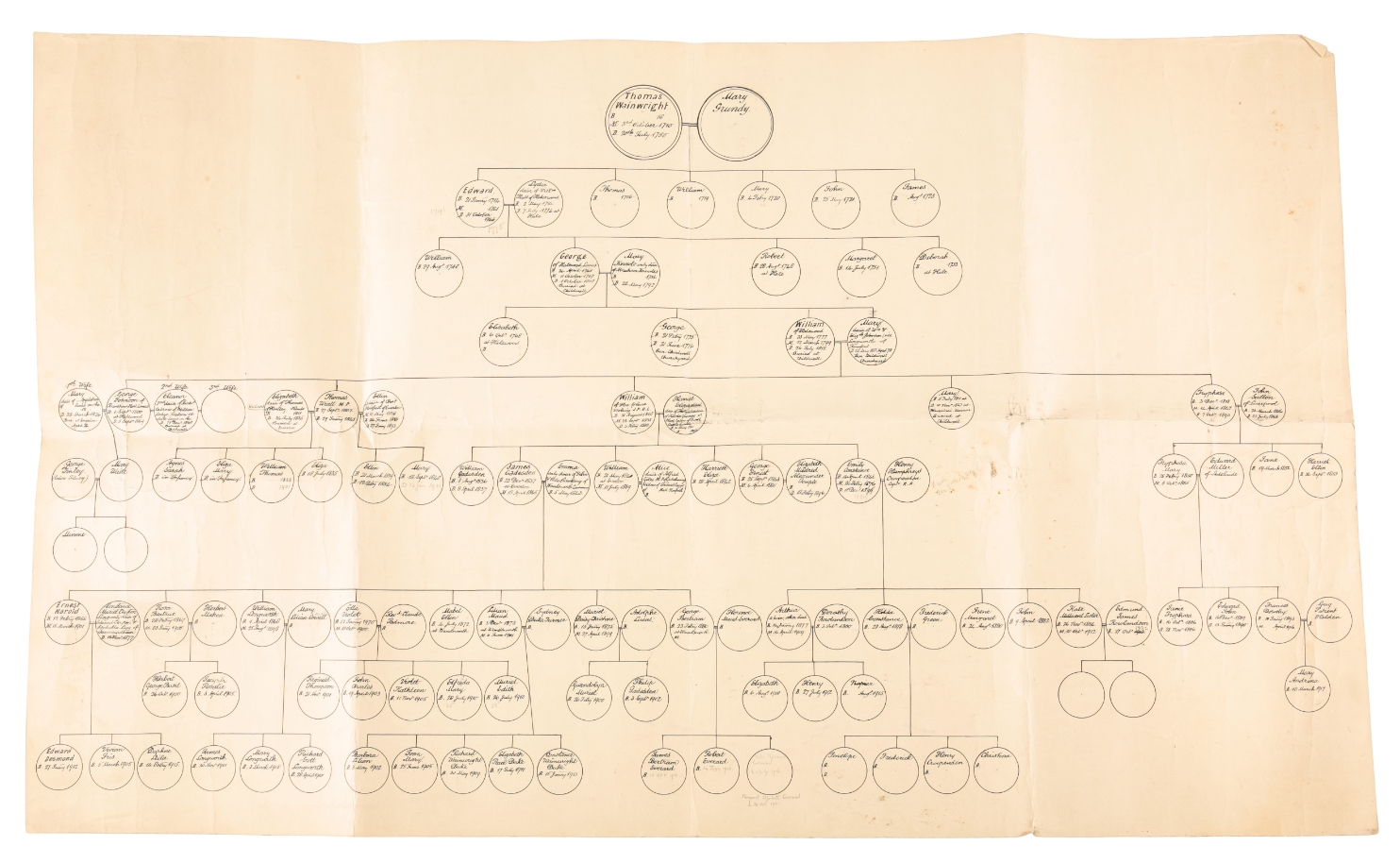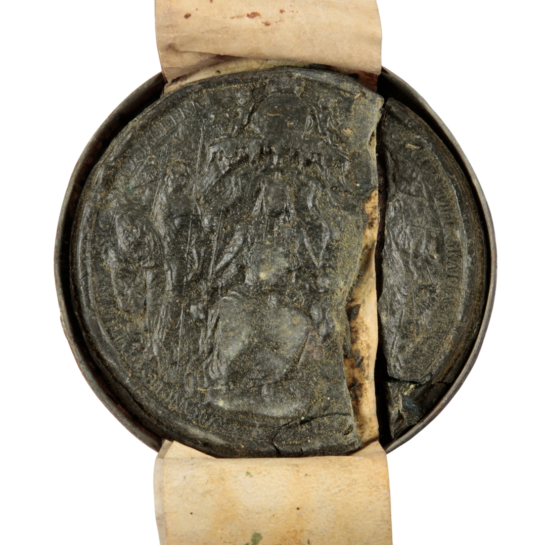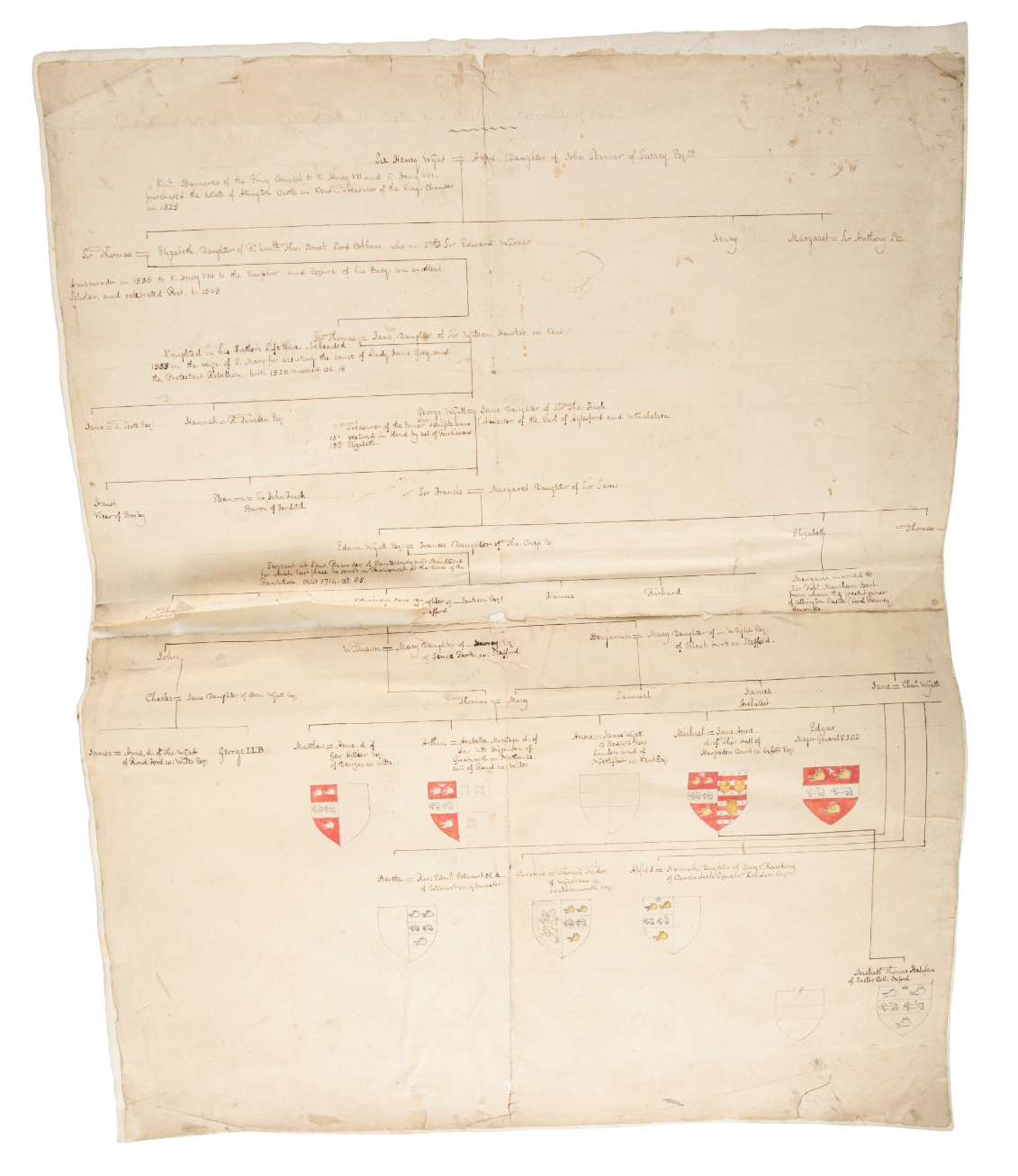 comprising a good number of manuscripts and documents on vellum,17th century and later, including a William and Mary manuscript bearing a double engraved portrait to the upper left and a seal (broken), a similar George I manuscript with a portrait upper left and a seal (damaged), a George III manuscript with portrait upper left and a seal, a large group of further legal documents, relating to the Wyatt and Wainwright families amongst others, to include property deeds, lease agreements, loans, statements, wills and probates, two family trees, for the Wainwright and Wyatt families, as well as a collection of 19th and 20th century letters, contained in a metal and a wooden chest (a lot)