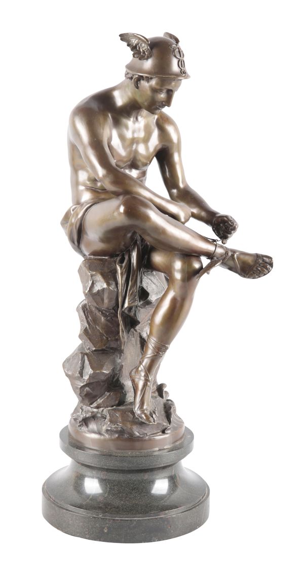 figured seated on a rocky outcrop tying the laces of his winged sandals, on a turned marble socle base, 58cm high overall