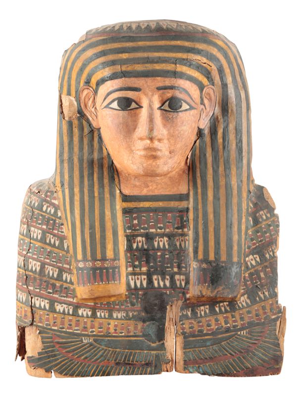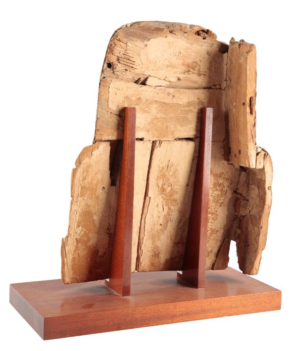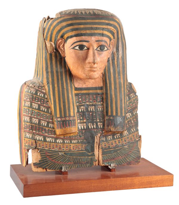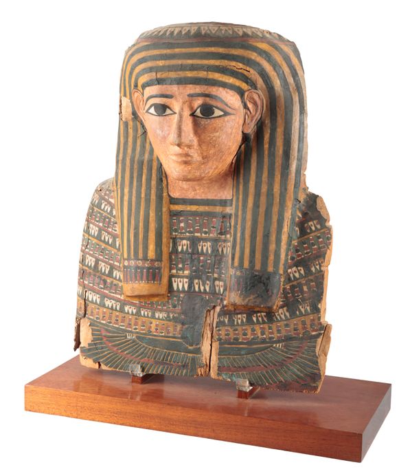 probably late Ptolemaic period or early Roman, 50BC-50AD, mounted on a wooden core, wearing a typical striped headdress, 57cm high x 46cm wide, on a later rectangular wooden plinth