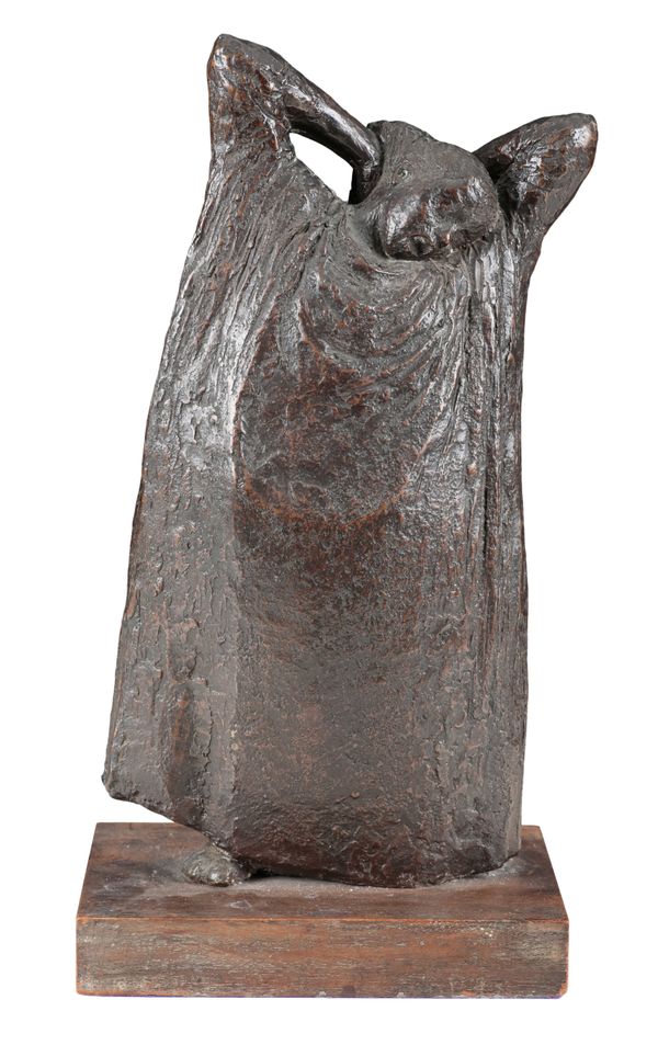 a patinated bronze figure of stretching woman in draped gown, mounted on wood plinth, 45.5cm high (including base)
