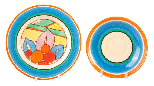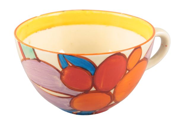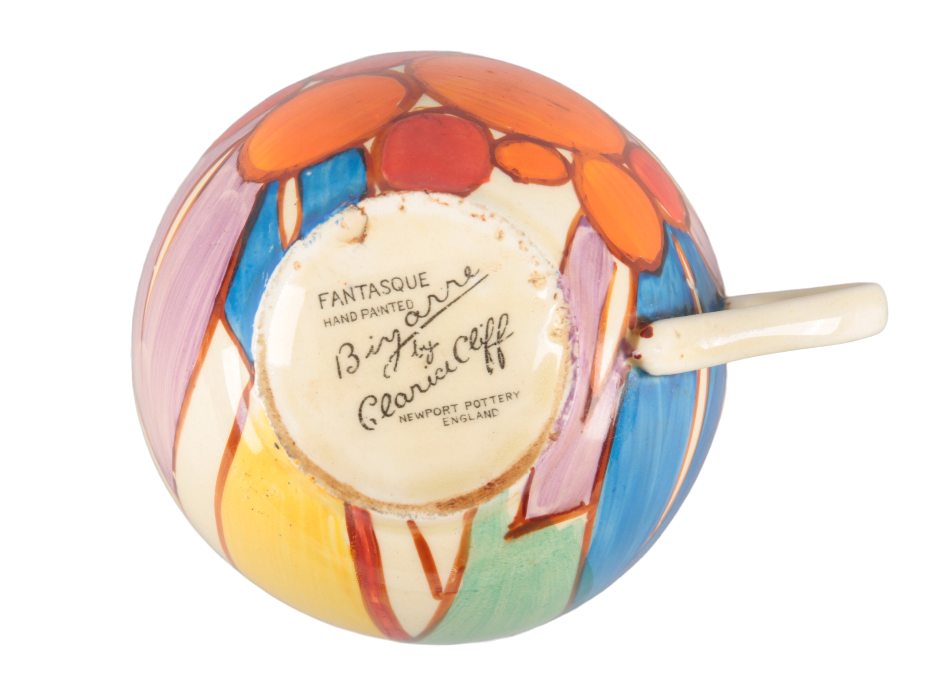 The base has two sets of printed marks to the base one stating Fantasque Bizarre by Clarice Cliff Newport Pottery and the other 'Wilkinson' 'Honeyglaze' (an attempt has been made to obscure the Wilkinson mark which is faded with a small indentation to the bottom)