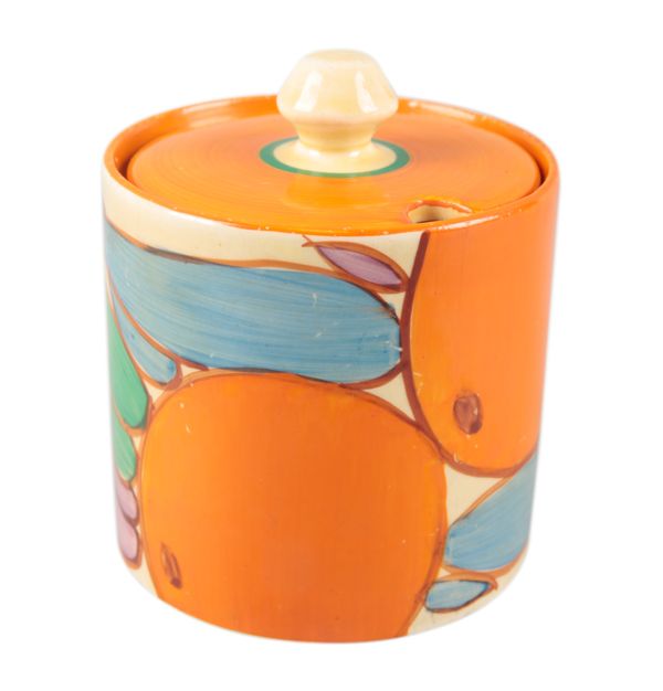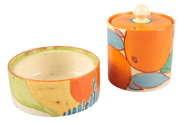 circa 1930, both stamped 'FANTASQUE... BIZARRE', comprising an 'Oranges' preserve jar and lid, decorated with fruits and stylised leaves, 12cm high, and a 'Windbells' sugar box and cover (top broken but present), 5cm high (2)