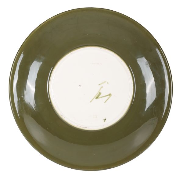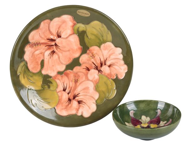 with impressed mark to base, 14.5cm diameter; together a large 'Hibiscus' plate on green ground, signed by artist and with impressed marks, 26cm diameter (2)