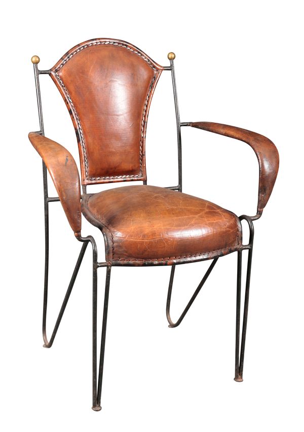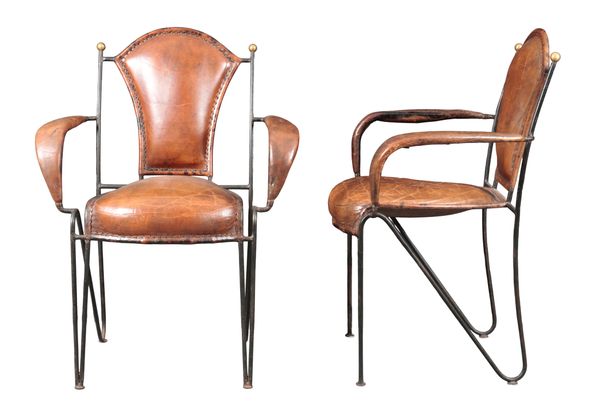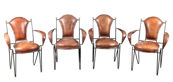 1950s, the arched backs with ball brass finials either side, upholstered in tan whip-stitched leather tapering and padded on the arms, backrest and seat, terminating on black enamelled iron hairpin legs, 89.5cm high (seat height 51cm) x 65.5cm wide x 64cm deep (4)