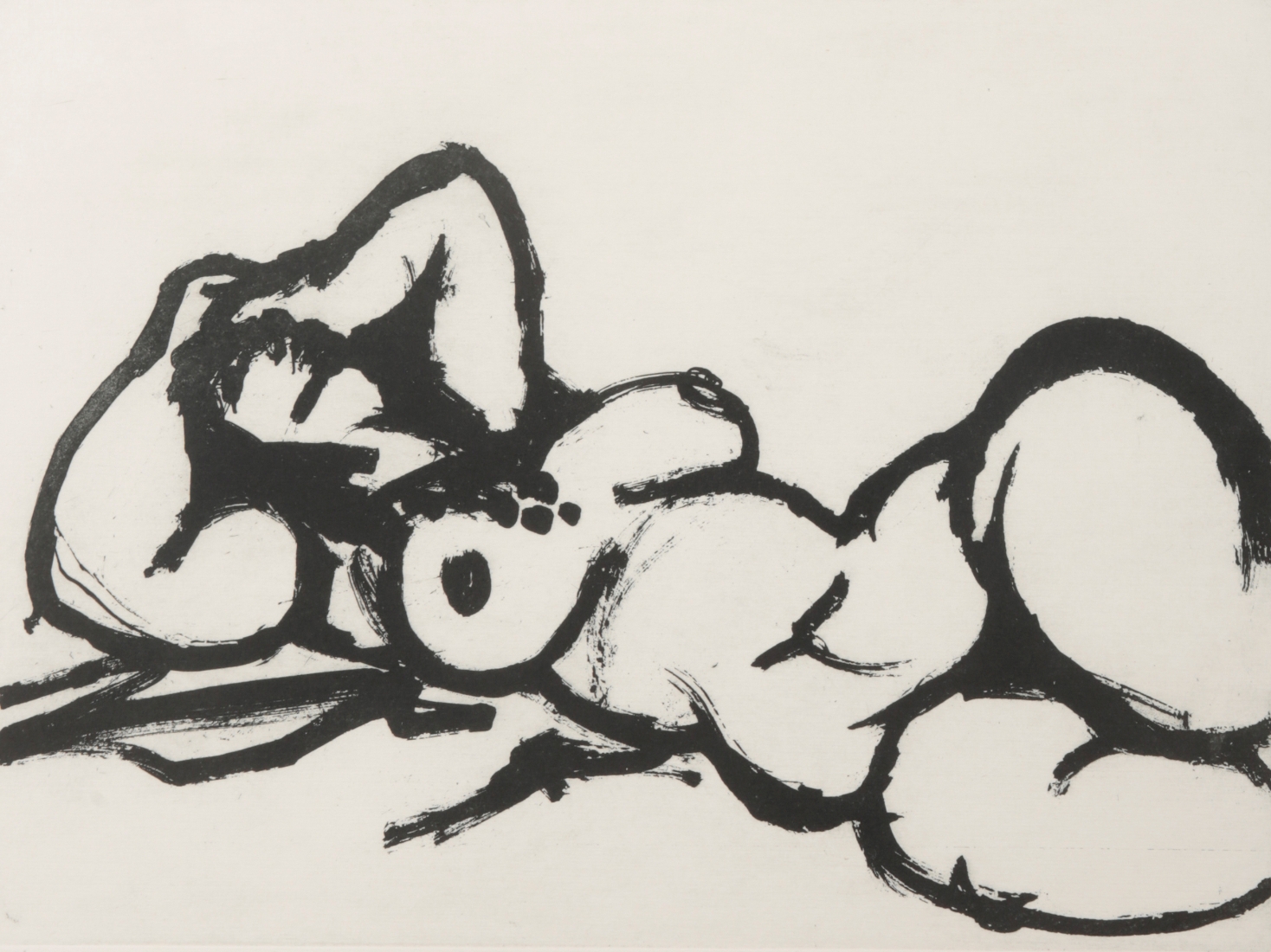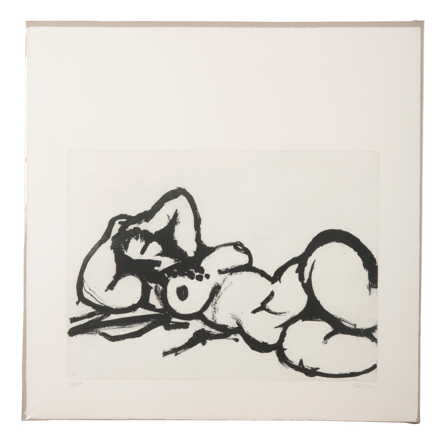 signed in pencil to margin, ed. 24/50, etching, 29cm x 39.5cm; together with a second etching by the same hand, also depicting a female nude (2)