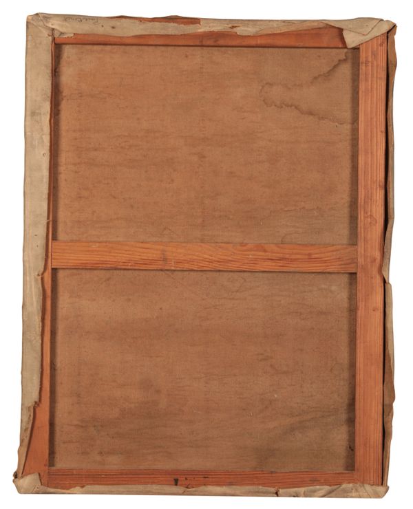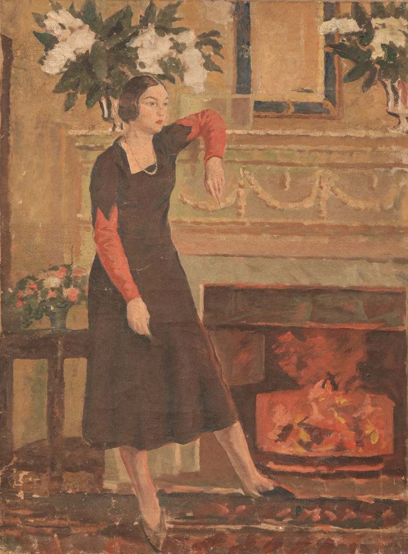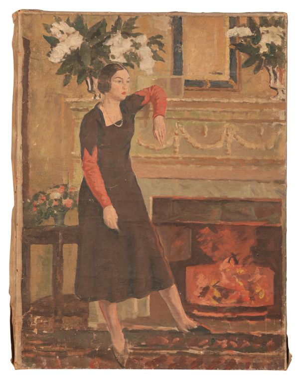 depicted full-length, leaning on a mantelpiece in an elegant interior, oil on canvas, 61cm x 46cm