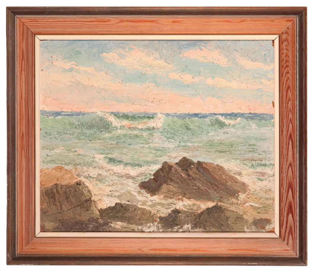 monogrammed lower right, oil on board, 47cm x 57cm