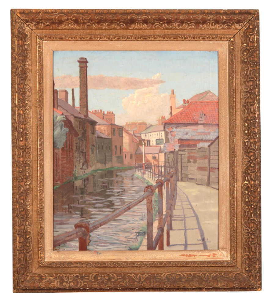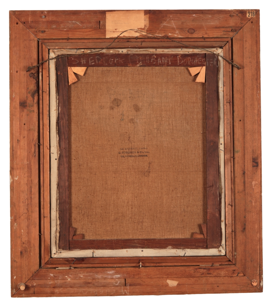 The painting is generally in fairly good, original condition and does not appear to have been relined. UV examination does not reveal any areas of in-painting or other restoration. Some small areas of loss are present to the picture surface. The picture surface is otherwise stable, with good canvas surface tension. There is moderate craquelure throughout, as well as some slight overall fading and areas of surface dirt and accretion; the painting would benefit from being cleaned. There are some losses to the frame. Please see additional images available on request.