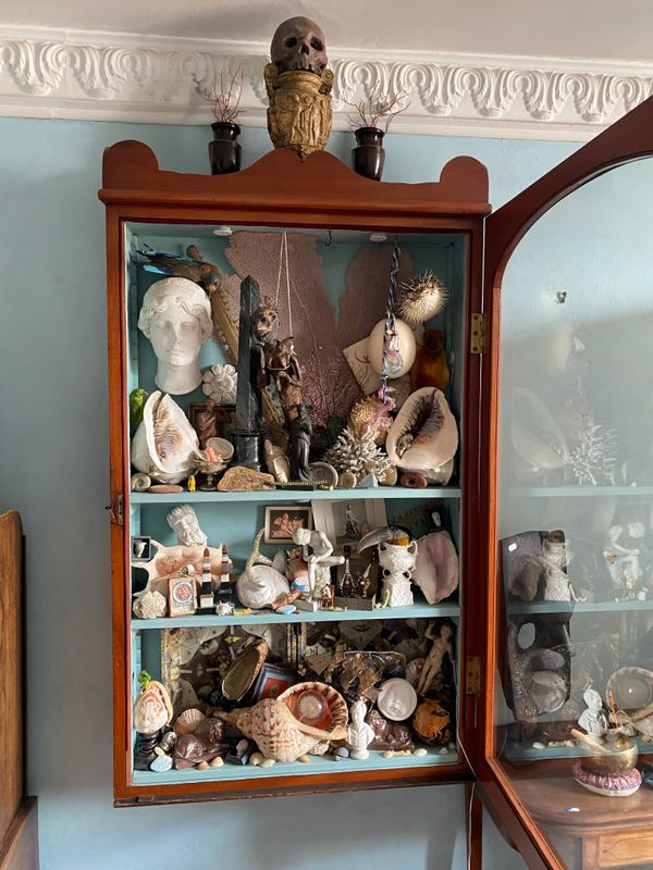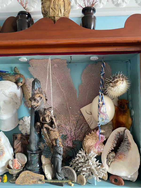 the mahogany glazed front cabinet containing various objects of natural and anthropological history, including a 'feejee' style faux taxidermy mermaid, taxidermy birds, several plaster casts after Roman-Greco sculptures, including the boy with thorn, a Roman mosaic fragment, several Egyptian faience ushabtis, a fossilised fish, a pair of 19th century salt glaze lions, an ostrich egg, numerous shells and other objects of interest, the cabinet 155cm high x 90cm wide x 27cm (a lot)
