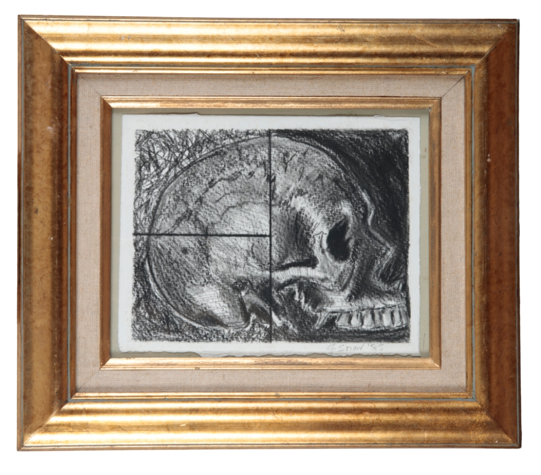 2018, signed and dated in pencil to margin, gouache and mixed media, 14cm x 19cm; together with a charcoal drawing of a skull by the same hand, 16cm x 21cm (2)